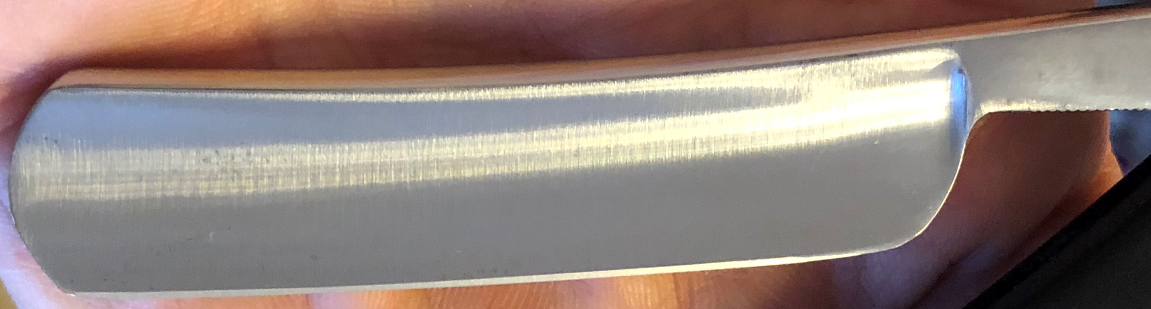 Бритва без следов пользования.Решил вдохнуть в клинок немного души и ручного творчества.Поперечную заводскую шлифовку переделал в ручной продольный сатин.Лицевая сторона полотна отшлифована до 10000 грит и отполирована, а обратная сторона клинка отшлифована до 400 грит. Грубый гринд примерно как на японских фреймах. Предварительно бритва была разобрана, почищен район осевого пина и снова собрана, с сохранением оригинальных пинов.Сталь чистая от разного рода видимых дефектов. Идеальная геометрия.Кромочка равномерна по всей длине и еле заметна.В общем и целом очень красивая эффектная бритва.Заточена и готова к бритью.