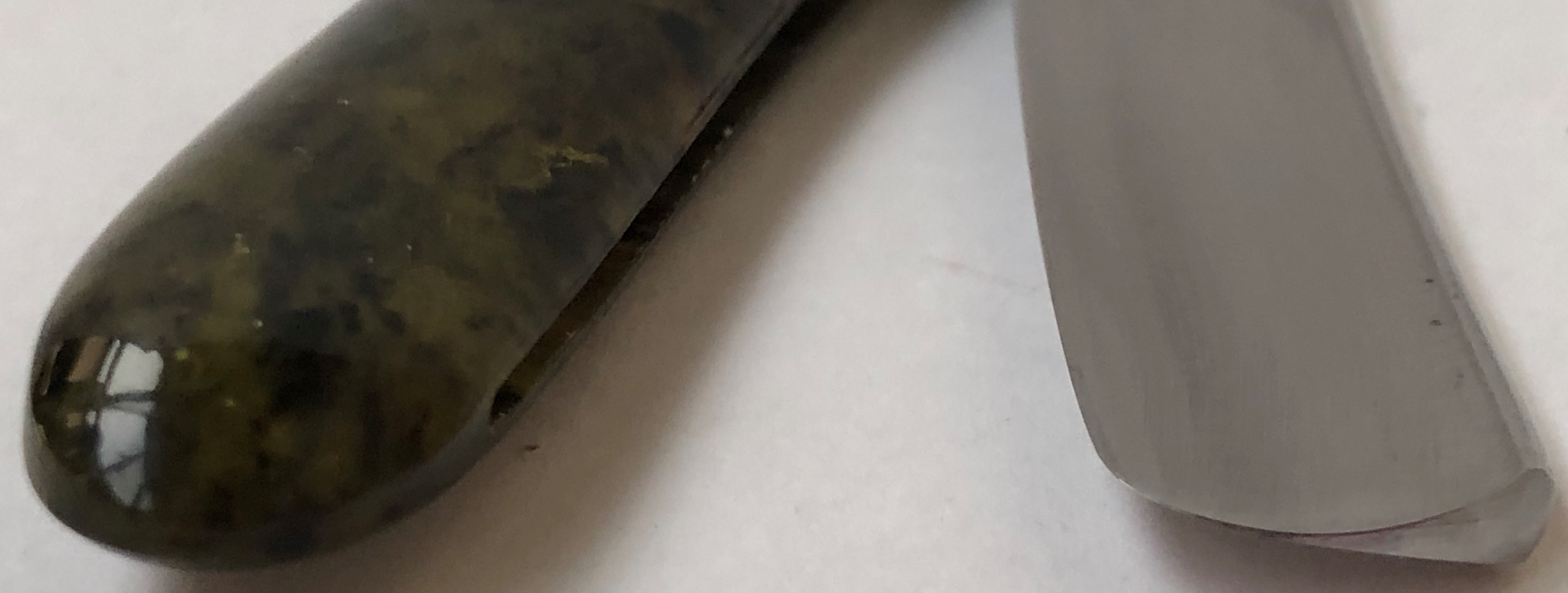 Камень со склада столярной мастерской.Подойдет для финиша бритв, ножей и другого РИ. При работе с бритвами выдает прекрасный результат, тактильно не такой "стеклянный".Ощущение мягкости хода присутствует.Практически не выдает собственной суспензии при работе с Асано нагурами.В комплекте идет томо-нагура,наверное от такой же породы:тонкая. Суспензия молочного оттенка и выделяется хорошо.Нож после такой доводки также получил практически бритвенную остроту. Для тонкой доводки бритв другого и не надо. Красивый, глубокий серо-зелёный цвет, с диагональными полосами.Рабочая поверхность без дефектов:трещин, пор, "волосяных линий" и прожилок.Отличный, универсальный экземпляр для разного инструмента, за счет своей толщины будет радовать не один десяток лет. Камень притерт и готов к работе.