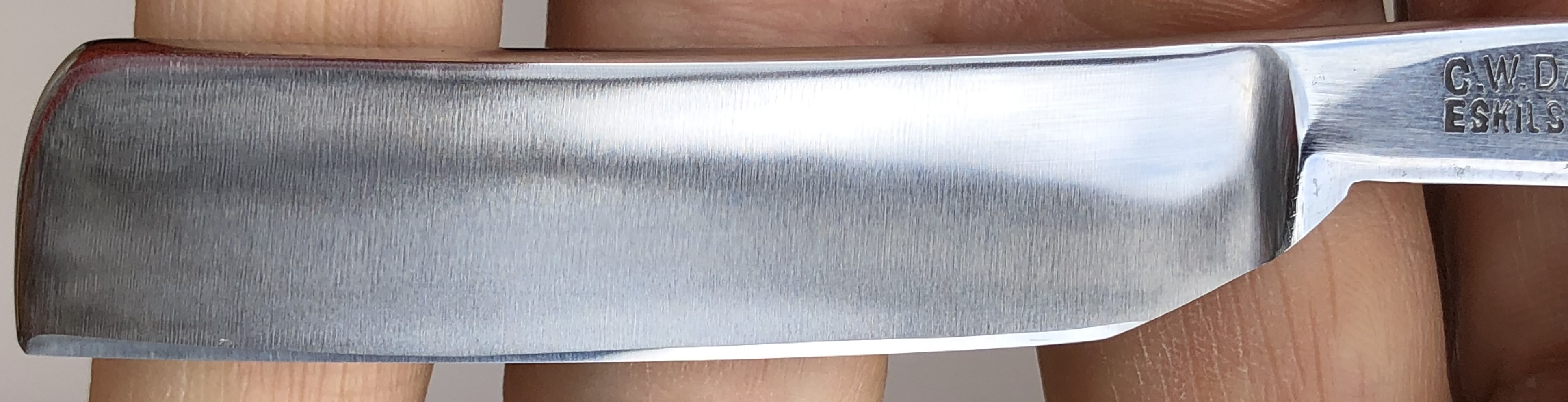 Бритва в состоянии приближенном к идеальному.Не разбиралась и не ремонтировалась. Единственно что, убрал на самых тонких абразивах пятна от остатков воды на клинке.Сформировал "типа-оригинальный" гринд полотна и умеренно отполировал.Сталь чистая от дефектов.Кромочка почти идеально ровная по всей длине. Родная коробочка в хорошем состоянии.