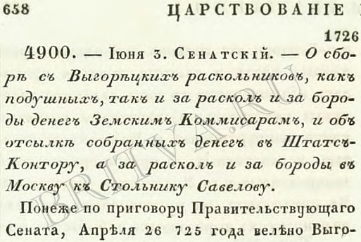 Фото №14: Екатерина I, 1726 г. Указ № 4900. - Iюня 3. - О сборѣ съ Выгорѣцкихъ раскольниковъ, какъ подушныхъ, такъ и за расколъ и за бороды денегъ Земскимъ Коммисарамъ, и объ отсылкѣ собранныхъ денегъ въ Штатсъ-Контору, а за расколъ и за бороды въ Москву къ Стольнику Савелову.