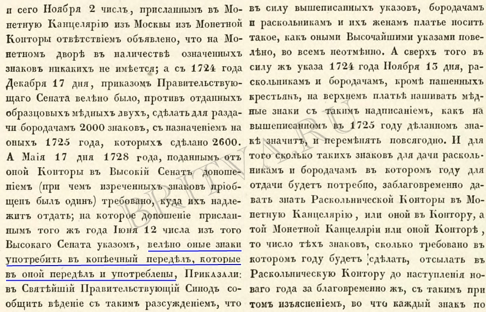 Фото №9: Пётр I, 1723 г. Указ № 4245. - Iюня 14. - О взыканіи съ торговыхъ людей, за небритіе бородъ, штрафа и объ увольненіи отъ онаго крестьянъ, которые привозятъ въ города на продажу сельскіе продукты и торгомъ не занимаются. Фото №10: Пётр I, 1724 г. Указ № 4596. - Ноябра 13. - О раздачѣ раскольникамъ для ношенія сверхъ платья особыхъ знаковъ, объ учрежденіи при Сенатѣ особливаго стола для сбору съ раскольниковъ денегъ и о ношеніи женам раскольниковъ особаго платья. Фото 11: Бородовой знак 1725 г. (Источник фото: monetnik.ru). На лицевой стороне надпись „СБОРОДЫ ПОШЛИНА ВЗѦТА”, оборотная сторона гладкая. По гурту надпись: „БОРОДА ЛИШНѦѦ ТѦГОТА”. Как я уже показал, до наших дней сохранилось только три основных вида бородовых знаков: 1699 г., 1705 г. и 1725 г. Императрица Екатерина I Фото №12: Екатерина I, 1726 г. Указ № 4893. - Маія 31. - О ношеніи отставнымъ изъ военной службы Нѣмецкаго платья и шпагъ, о бритіи бородъ и о содержаніи себя въ чистотѣ. Фото №13: продолжение указа № 4893 Фото №14: Екатерина I, 1726 г. Указ № 4900. - Iюня 3. - О сборѣ съ Выгорѣцкихъ раскольниковъ, какъ подушныхъ, такъ и за расколъ и за бороды денегъ Земскимъ Коммисарамъ, и объ отсылкѣ собранныхъ денегъ въ Штатсъ-Контору, а за расколъ и за бороды въ Москву къ Стольнику Савелову. Фото №15: продолжение указа № 4900 Фото №16: продолжение указа № 4900