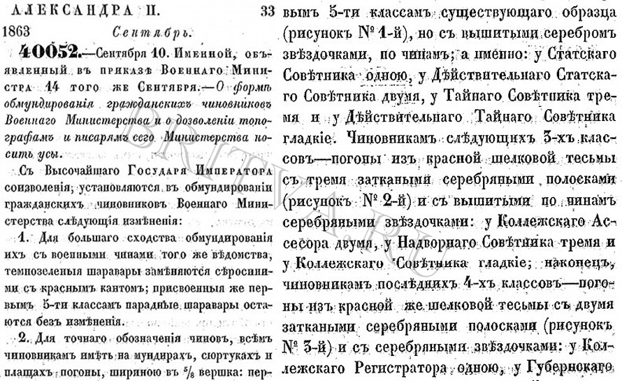 Фото №44: Александр II, 1863 г. Указ № 40052. - Сентября 10. - О формѣ обмундированія гражданскихъ чиновниковъ Военнаго Министерства и о дозволеніи топографамъ и писарямъ сего Министерства носить усы. Фото №45: продолжение указа № 40052 Фото №46: Александр II, 1863 г. Указ № 40093. - Октября 4. - О формѣ обмундированія гражданскихъ чиновниковъ вѣдомства путей сообщенія, имѣющихъ мундиръ военнаго покроя, и о дозволеніи кондукторамъ и писарямъ сего вѣдомства носить усы. Фото №47: продолжение указа № 40093 Фото №48: Сводъ Военныхъ постановленій 1869 года Кн. VII. – Прохожденіе службы по воен. вѣд. „Статья 855. Всѣ генералы, штабъ-и оберъ-офицеры и нижніе чины всѣхъ родовъ войскъ, равно и всѣ гражданскіе чиновники военнаго вѣдомства, должны носить усы. Относительно ношенія бороды постановлено: а) всѣ вообще генералы, штабъ- и оберъ-офицеры и гражданскіе чиновники могуть носить бороды, по желанію; б) могутъ также носить бороды и всѣ нижніе чины; в) нижнимъ чинамъ войскъ гвардіи и гренадеръ бородъ не брить”. Фото №49: Александр II, 1874 г. Указ № 53839. - Августа 20. - О разрѣшеніи носить бороды служащимъ во всѣх войскахъ, кромѣ гвардіи и гренадеръ, а также лицъ, состоящихъ въ Свитѣ Его Величества и чиновъ Главныхъ Управленій Военнаго Министерства. Фото №50: Александр II, 1874 г. Указ № 53830. - Августа 20. - О разрѣшеніи носить бороды служащимъ во всѣхъ командахъ морскаго вѣдомства, кромѣ гвардейского экипажа, а также лицъ, состоящихъ въ Свитѣ Его Величества и чиновъ, служащихъ въ учрежденіяхъ Морскаго Министерства.
