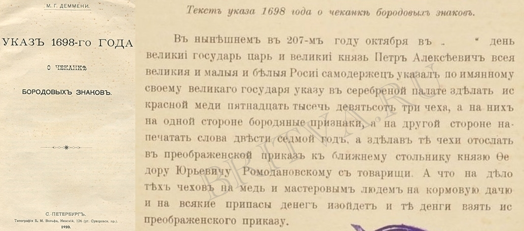 от себя добавлю ссылку на книжку "Исторические этюды русской жизни" автор Владимир Михневич издание 1879 года. Глава называется "История русской бороды". Давно хотел ее пристроить, а тут такая тема!)) в ней достаточно подробно о указах Алексея Михайловича, о причинах таких приказов и упоминание о первых приказах Петра, и уже тогда говорится, что эти петровские приказы не сохранились. ну, в общем 100 страниц интересного чтива. https://archive.org/details/libgen_0031 ... 9/mode/2up