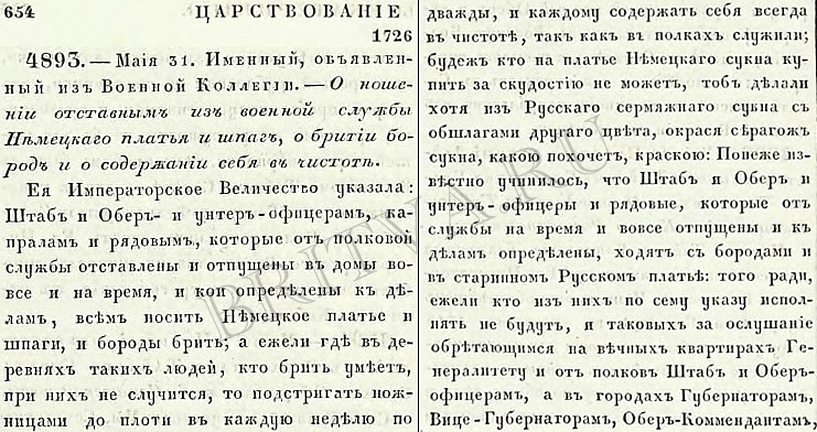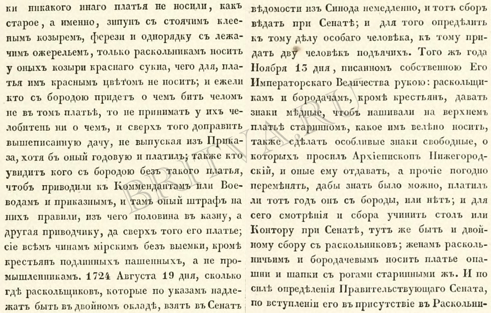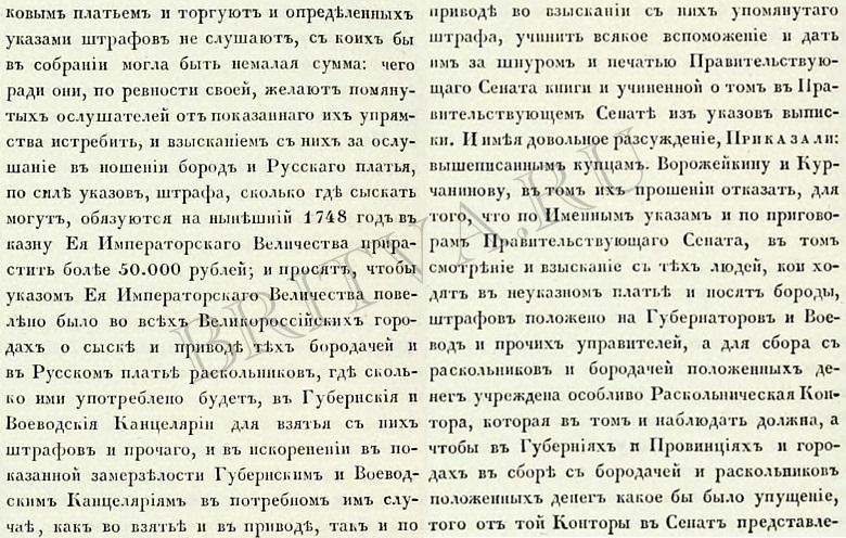 Императрица Анна Ивановна Фото №17: Анна Ивановна, 1735 г. Указ № 6780. - Iюля 29. - О присылкѣ вѣдомостей въ Раскольническую Контору о раскольникахъ и бородачахъ, въ началѣ каждаго года; о сборѣ съ нихъ денегъ и недоимокъ и объ отдачѣ изъ оной Конторы ежемѣсячно поступающихъ въ приходъ денегъ въ Московскую Рентерею для употребленiя въ расходъ, по предписанiю Штатсъ-Конторы. Императрица Елизавета Петровна Фото №18: Елизавета Петровна, 1743 г. Указ № 8707. - Февраля 19. - О ношеніи Нѣмецкаго платья, о бритіи бородъ и усовъ, о хожденіи раскольникамъ въ указномъ для нихъ одѣяніи. Фото №19: продолжение указа № 8707 Фото №20: продолжение указа № 8707 Фото №21: Елизавета Петровна,1748 г. Указ № 9479. - Февраля 11. - О подтвержденіи, чтобы никто, кромѣ священнаго и церковнаго причта и крестьянъ, не ходилъ въ неуказномъ платьѣ и не носилъ бороды. Фото №22: продолжение указа №9479 Фото №23: продолжение указа №9479