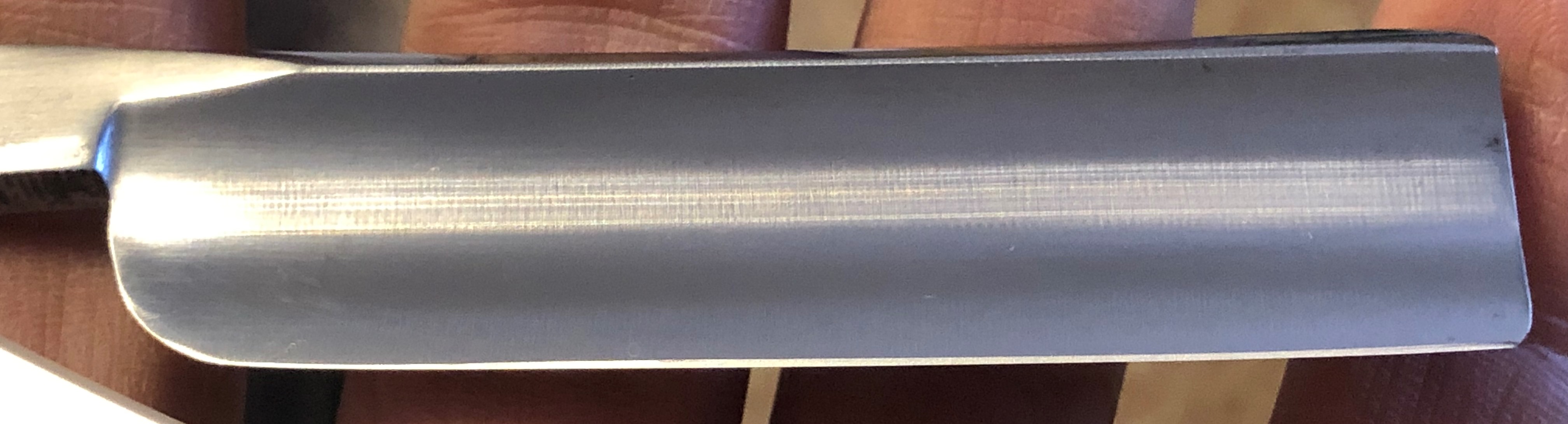 Клинок в нормальном состоянии. По какой то причине была сточена "ступенька" перехода полотна к эрлю. Под обушком,с лицевой стороны, в районе пятки получилась небольшая "ямка" ни на что не влияющая. Смею предположить, что "ступенька" была сточена для каких то барберских целей, чисто под мастера, которому именно так было удобно работать с инструментом. Вижу такое еже не первый раз.