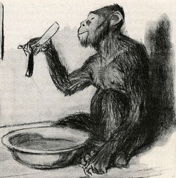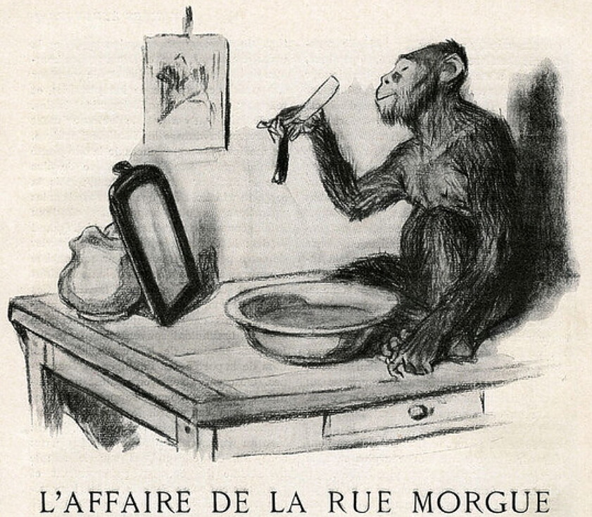 Иллюстрация для романа Эдгара Аллан По „The Murders in the Rue Morgue” (фр. „L'affaire de la rue Morgue” - „Убийства на улице Морг”) „Le singe et le rasoir” „ Обезьяна и бритва”, 1910 г. Взглянем поближе: С 2013 г. с кайфом бреюсь опасной бритвой пять раз в неделю, в три прохода.