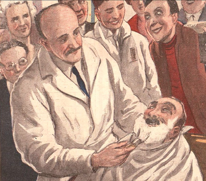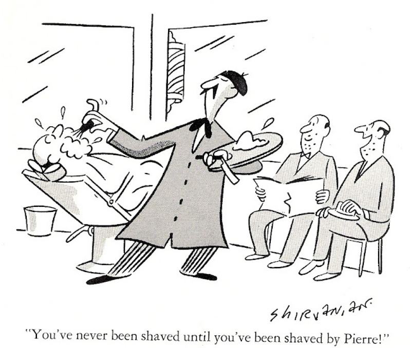 „You've never been shaved until you've been shaved by Pierre!” „Ты никогда не брился, пока тебя не побрил Пьер”, 1953 г. Пьер работает как художник С 2013 г. с кайфом бреюсь опасной бритвой пять раз в неделю, в три прохода.