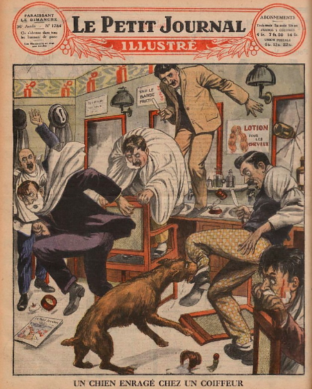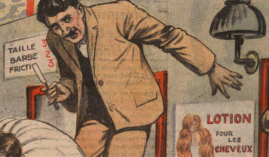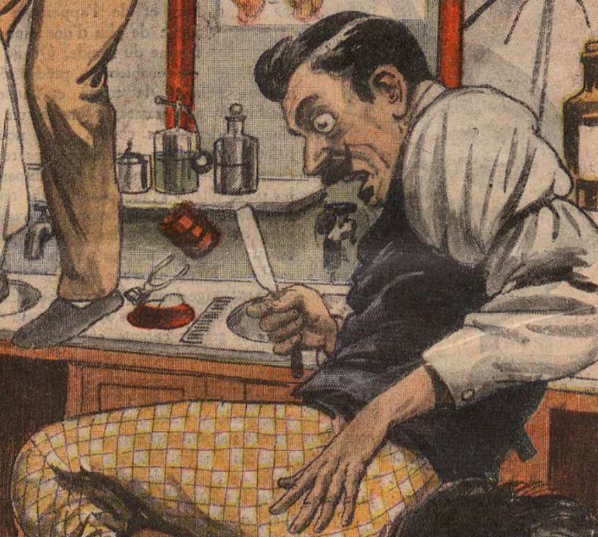 И сново Raoul Thomen (1876-1950). Рауль Томен - бельгийский иллюстратор, карикатурист и автор комиксов. Он рисовал для журнала „L'Oeil de la Police” („Полицейский глаз”) - французский еженедельный журнал, основанный в январе 1908 года и исчезнувший в июле 1914 года. В журнале публиковались детективные и полицейские романы, драматические факты, страстные или трагические события, драмы любви, драмы жизни, драмы смерти, а также криминальных новостей во Франции и за рубежом. Иллюстрация Рауля Томена из журнала „L'Oeil de la Police”, №28, 1908 года „Un barbier ivre qui tue à coups de rasoir” „Пьяный цирюльник, который убивает бритвой” Взглянем поближе: С 2013 г. с кайфом бреюсь опасной бритвой пять раз в неделю, в три прохода.