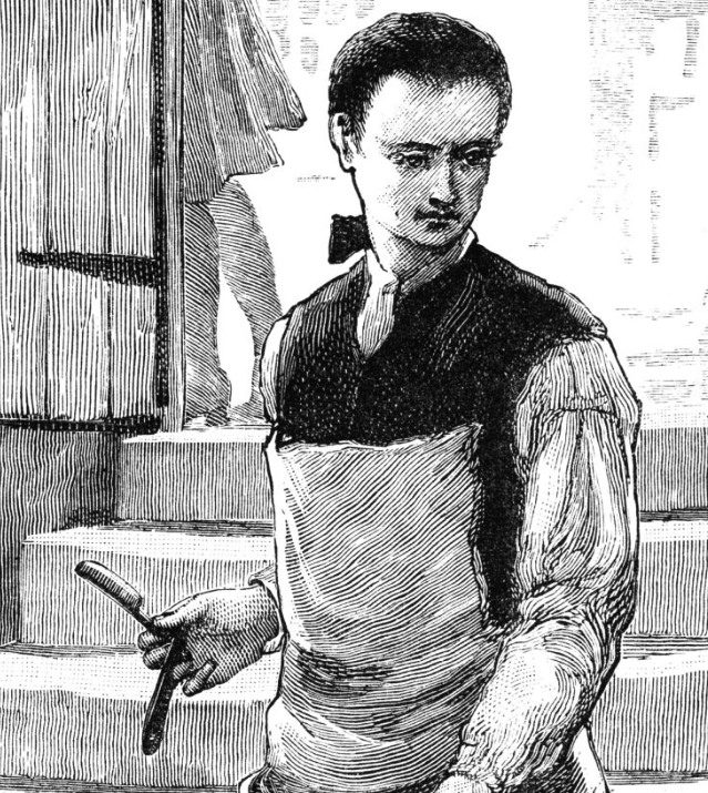 На гравюре нарисован Ричард Аркрайт - крупный английский текстильный промышленник, изобретатель, владелец многочисленных патентов в области прядения, который в начале своей трудовой жизни работал цирюльником и мастером париков. „Strange contrivances were beginning to shape themselves in his busy brain” „В его напряженном мозгу начинали формироваться странные выдумки” Взглянем поближе: С 2013 г. с кайфом бреюсь опасной бритвой пять раз в неделю, в три прохода.