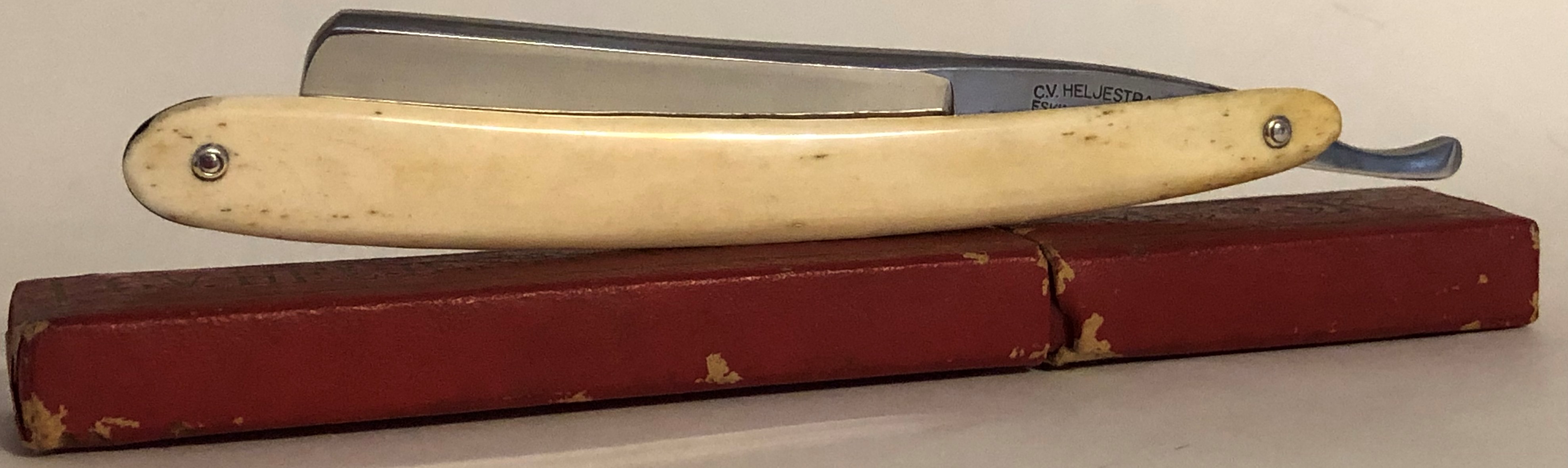Клинок не имеет следов пользования. Практически в идеальном состоянии.Небольшой след окисления в районе носика аккуратно почистил и заново заполировал.Практически незаметно. Ручку снял, чтобы убрать окисление в районе осевого пина и снова собрал, добавив внутренние шайбы и поменяв пины на немецкие двух-цветные втулки.Геометрия полотно ювелирно идеальная:кромочка равномерна по всей длине и практически незаметна.Металл чистый, без дефектов. Гравировка с изображением быка и бандерилье́ро четкое, без стертых мест. Исходя из своего опыта пользования этими легендарными бритвами, бритье выходит очень качественным, мягким и чистым.Сталь хорошо точится и доводится и хорошо держит заточку.Бритва заточена и готова к пользованию.На выбор две оригинальные коробочки.