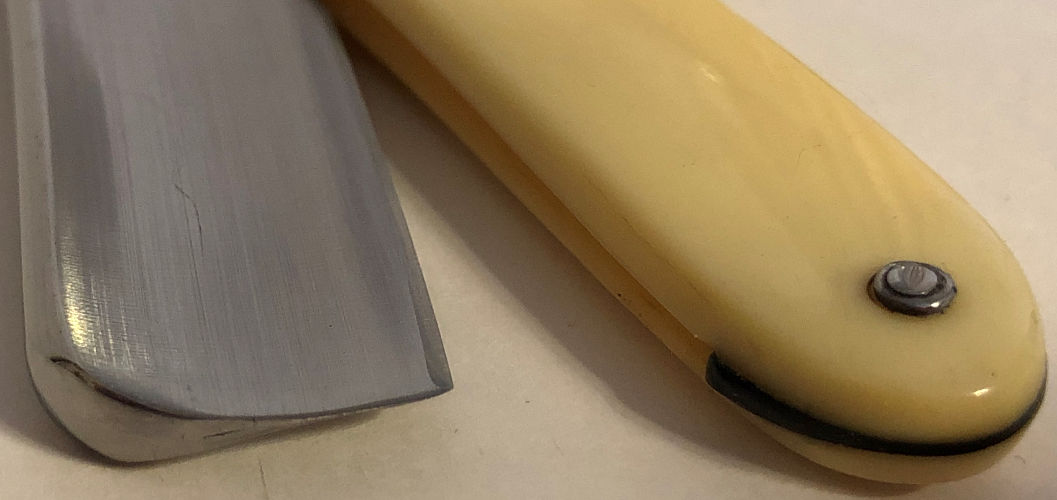 Клинок в нормальном состоянии. По какой то причине была сточена "ступенька" перехода полотна к эрлю. Под обушком,с лицевой стороны, в районе пятки получилась небольшая "ямка" ни на что не влияющая. Смею предположить, что "ступенька" была сточена для каких то барберских целей, чисто под мастера, которому именно так было удобно работать с инструментом. Вижу такое еже не первый раз.