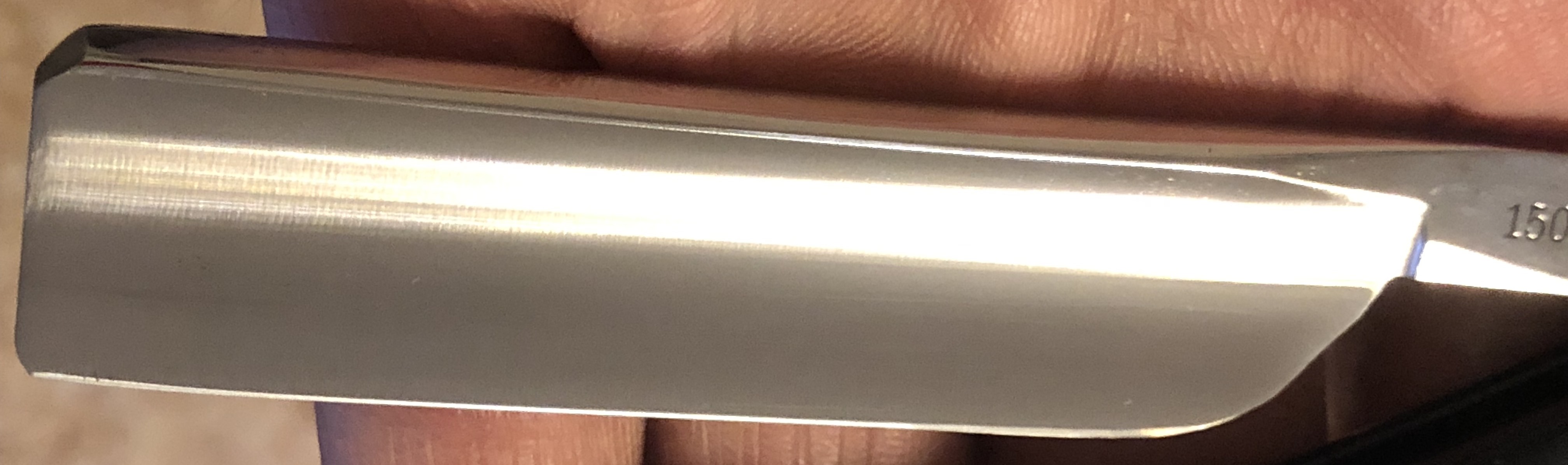 Сама пластина лезвия была вручную продольно отшлифована до 800 грит, на камнях.Остальное"тело" бритвы было доведено практически до "зеркала". Такая комбинированная шлифовка, как и должна была выглядеть бритва изначально.Идеальная геометрия полотна. Кромочка равномерна по всей длине и еле заметна.За счет толстого обушка и мощной оправы бритва тяжёлая, что очень хорошо при контроле самого процесса бритья, чувствуется в руке и не даёт возможность часто резаться.Сталь и кромка чистые, без видимых дефектов.
