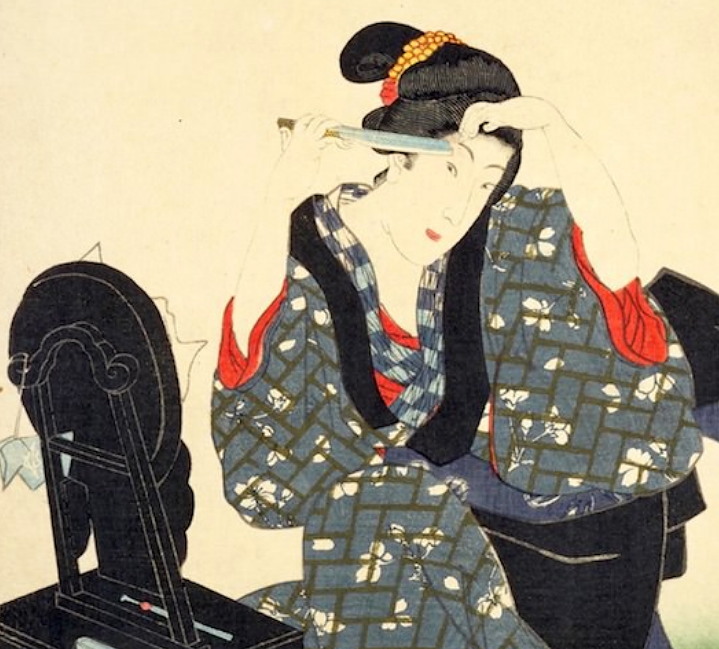 Utagawa Kunisada (Toyokuni III) (1786-1864). Утагава Кунисада, известен также как Утагава Тоёкуни III - крупнейший японский художник и мастер цветной графики периода Эдо. „Shiba Shinmei”. From the series „One Hundred Beautiful Women at Famous Sites of Edo” „Сиба Синмей”. Из серии „Сто красивых женщин в известных местах Эдо”, 1858 г. (Сиба Синмей сбривает брови) Взглянем поближе: С 2013 г. с кайфом бреюсь опасной бритвой пять раз в неделю, в три прохода.