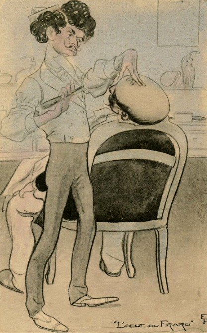 „Le barbier” „Цирюльник”, около 1920 г. Встречается и в нецветном виде: Взглянем поближе: С 2013 г. с кайфом бреюсь опасной бритвой пять раз в неделю, в три прохода.