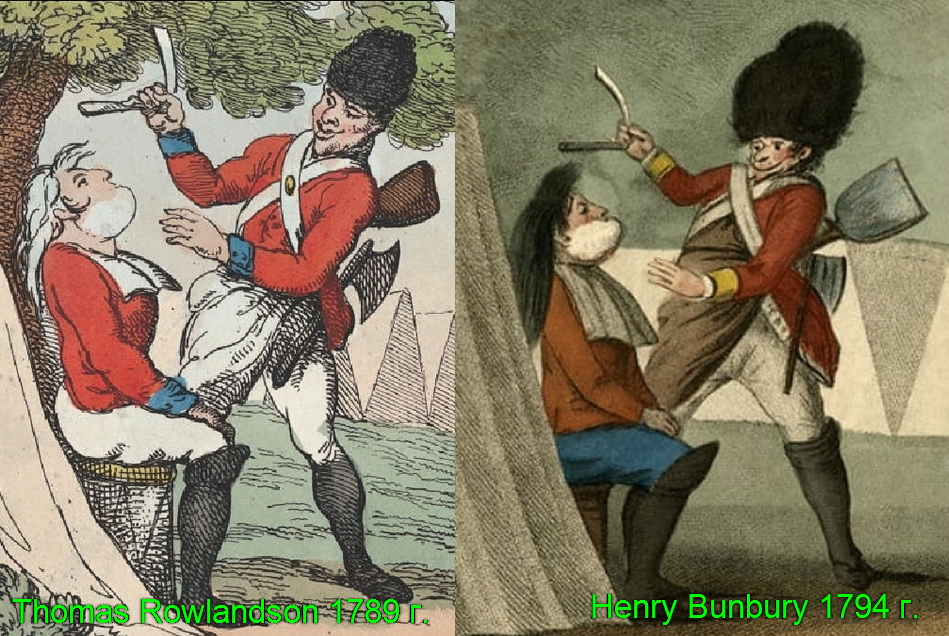 Thomas Rowlandson (1757-1827). Томас Роулендсон - английский художник, карикатурист, книжный иллюстратор. Он рекламирует мыла для бритья „Pears”. „Shaving in camp” „Бритье в лагере”, 1789 г. Встречается и в цветном виде без рекламы: Взглянем поближе: Очень интересно, что подобную картину уже показывали: viewtopic.php?p=237366#p237366, но все же они различаются. Кроме того Henry William Bunbury нарисовал ее позже на пять лет, в 1794 г. Посмотрите на отличия: