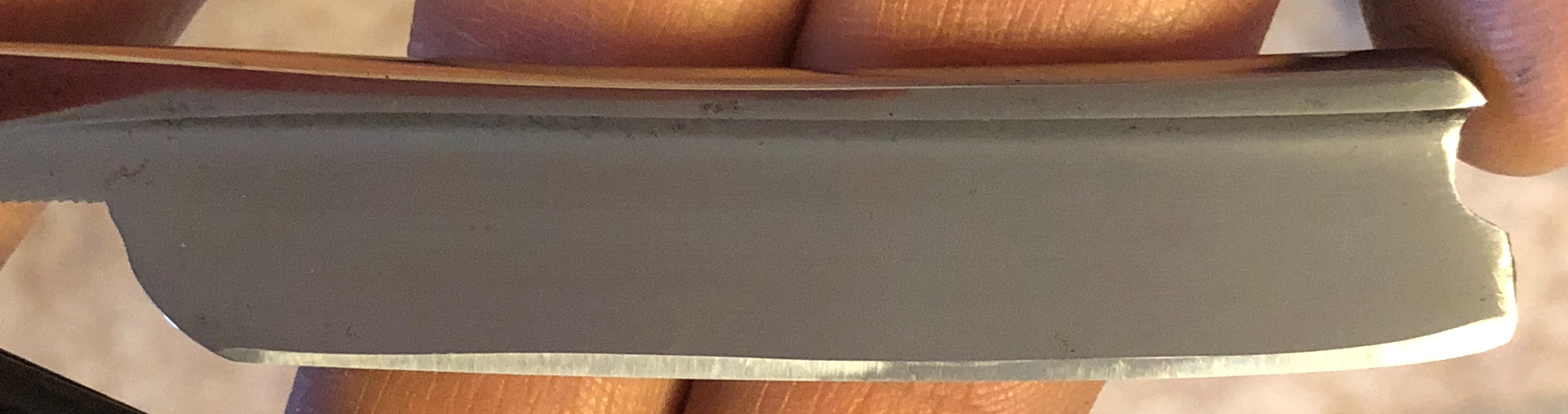 Бритва непользованная, но была разобрана,для удаления окисления в районе осевого пина.Также, прошелся самыми тонкими абразивами по полотну,что позволило восстановить былую свежесть и блеск.Идеальная геометрия клинка:кромочка равномерна по всей длине и практически незаметна.Состояние новой бритвы.Сталь и кромочка чистые от дефектов.Потихоньку тестируя такую же заточенную уже бритву прихожу к выводу, что сталь имеет среднюю твердость и в бритье чем то напоминает англичан начала прошлого века.Бритьё мягкое и чистое, без заметной агрессии. На мой взгляд, подобная форма лезвия и удачный выбор стали и закалки делает инструмент просто незаменимым на все случаи жизни и держа такую бритву, просто не хочется выпускать из рук. Все четко,идеально и без излишеств. Перед отправкой будет заточена и доведена до комфортного бритья.