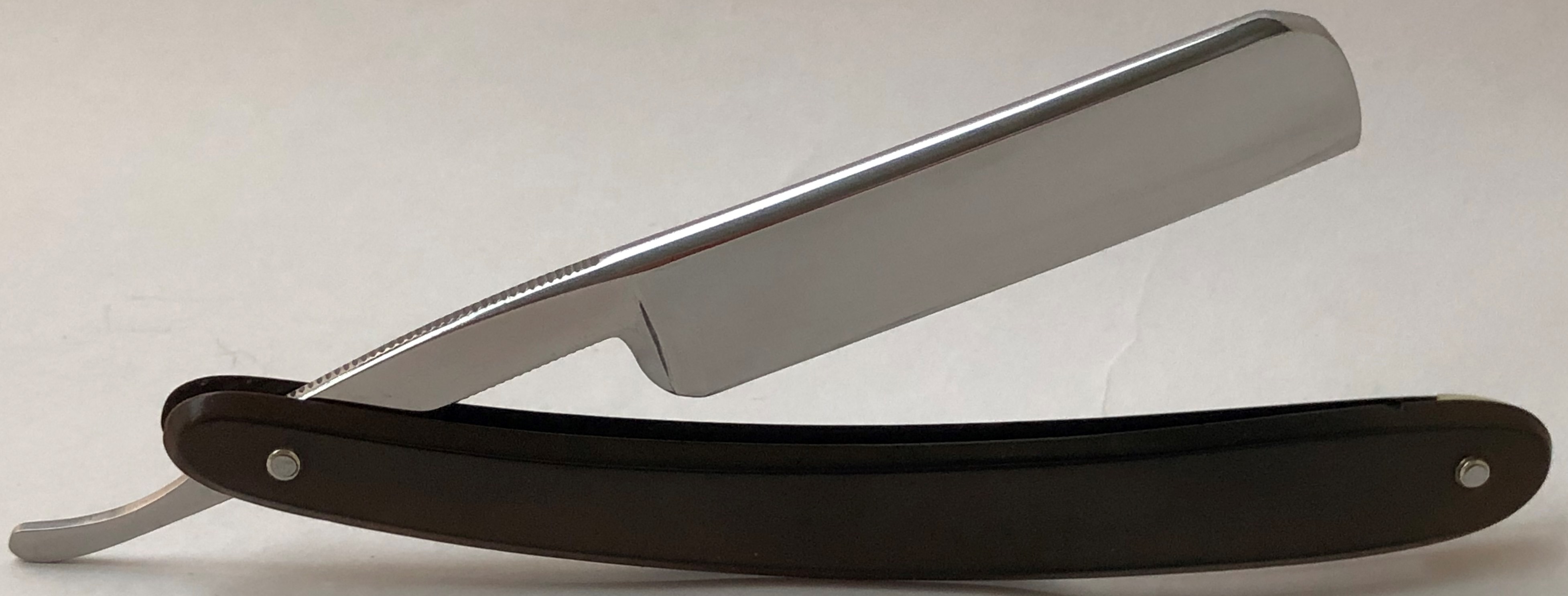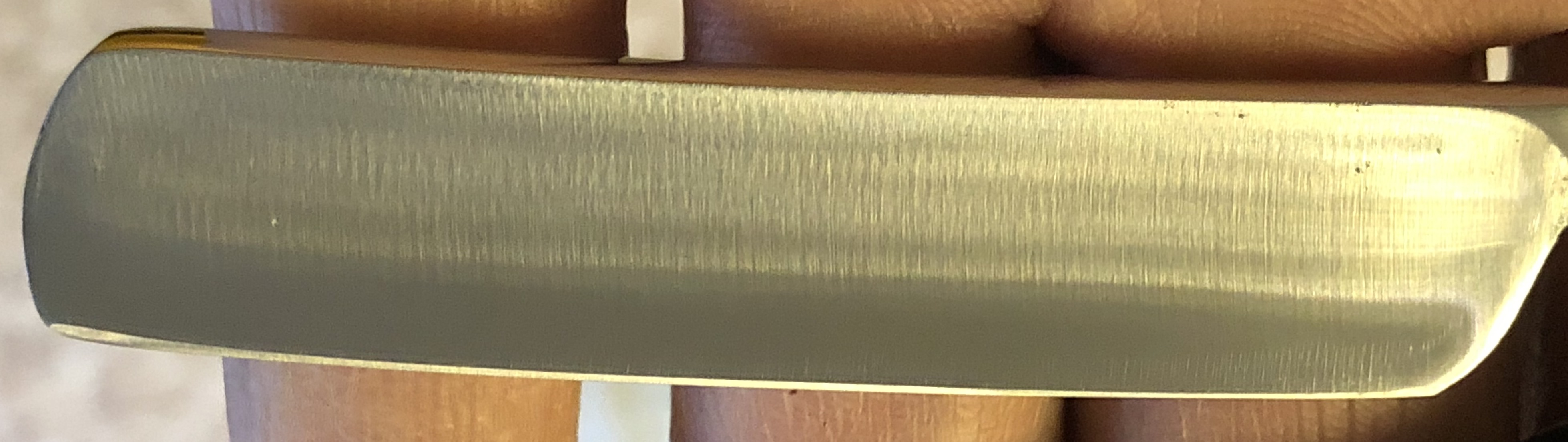 Бритва непользованная, но была разобрана,для удаления окисления в районе осевого пина.Также, прошелся самыми тонкими абразивами по полотну,что позволило восстановить былую свежесть и блеск.Идеальная геометрия клинка:кромочка равномерна по всей длине и практически незаметна.Состояние новой бритвы.Сталь и кромочка чистые от дефектов.Потихоньку тестируя такую же заточенную уже бритву прихожу к выводу, что сталь имеет среднюю твердость и в бритье чем то напоминает англичан начала прошлого века.Бритьё мягкое и чистое, без заметной агрессии. На мой взгляд, подобная форма лезвия и удачный выбор стали и закалки делает инструмент просто незаменимым на все случаи жизни и держа такую бритву, просто не хочется выпускать из рук. Все четко,идеально и без излишеств. Перед отправкой будет заточена и доведена до комфортного бритья.