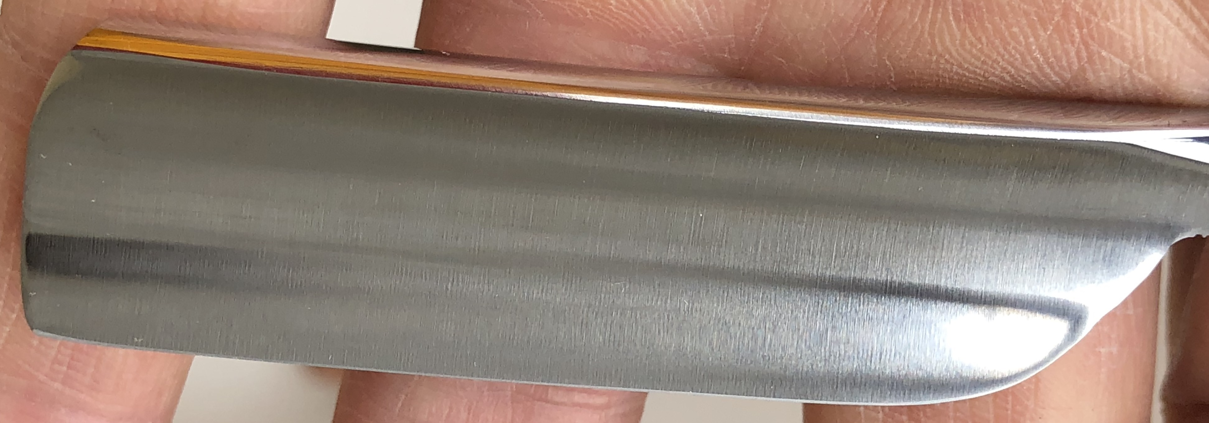 Бритва непользованная, но была разобрана,для удаления окисления в районе осевого пина.Также, прошелся самыми тонкими абразивами по полотну,что позволило восстановить былую свежесть и блеск.Идеальная геометрия клинка:кромочка равномерна по всей длине и практически незаметна.Состояние новой бритвы.Сталь и кромочка чистые от дефектов.Потихоньку тестируя такую же заточенную уже бритву прихожу к выводу, что сталь имеет среднюю твердость и в бритье чем то напоминает англичан начала прошлого века.Бритьё мягкое и чистое, без заметной агрессии. На мой взгляд, подобная форма лезвия и удачный выбор стали и закалки делает инструмент просто незаменимым на все случаи жизни и держа такую бритву, просто не хочется выпускать из рук. Все четко,идеально и без излишеств. Перед отправкой будет заточена и доведена до комфортного бритья.