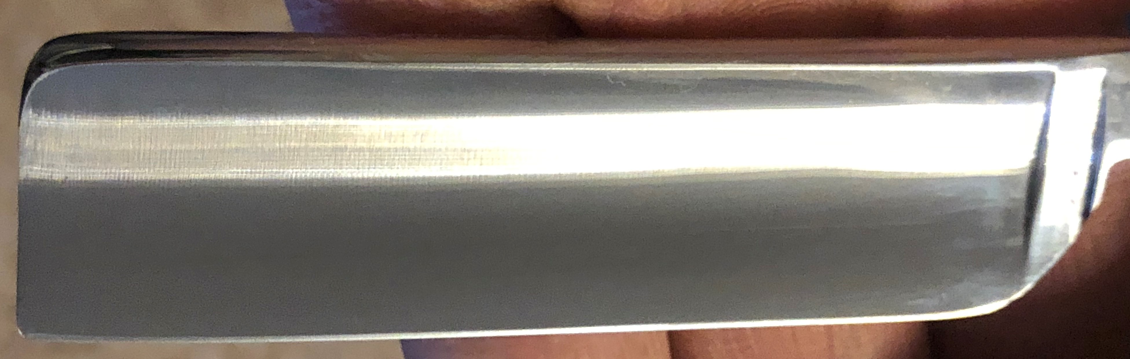 Бритва непользованная, но была разобрана,для удаления окисления в районе осевого пина.Также, прошелся самыми тонкими абразивами по полотну,что позволило восстановить былую свежесть и блеск.Идеальная геометрия клинка:кромочка равномерна по всей длине и практически незаметна.Состояние новой бритвы.Сталь и кромочка чистые от дефектов.Потихоньку тестируя такую же заточенную уже бритву прихожу к выводу, что сталь имеет среднюю твердость и в бритье чем то напоминает англичан начала прошлого века.Бритьё мягкое и чистое, без заметной агрессии. На мой взгляд, подобная форма лезвия и удачный выбор стали и закалки делает инструмент просто незаменимым на все случаи жизни и держа такую бритву, просто не хочется выпускать из рук. Все четко,идеально и без излишеств. Перед отправкой будет заточена и доведена до комфортного бритья.