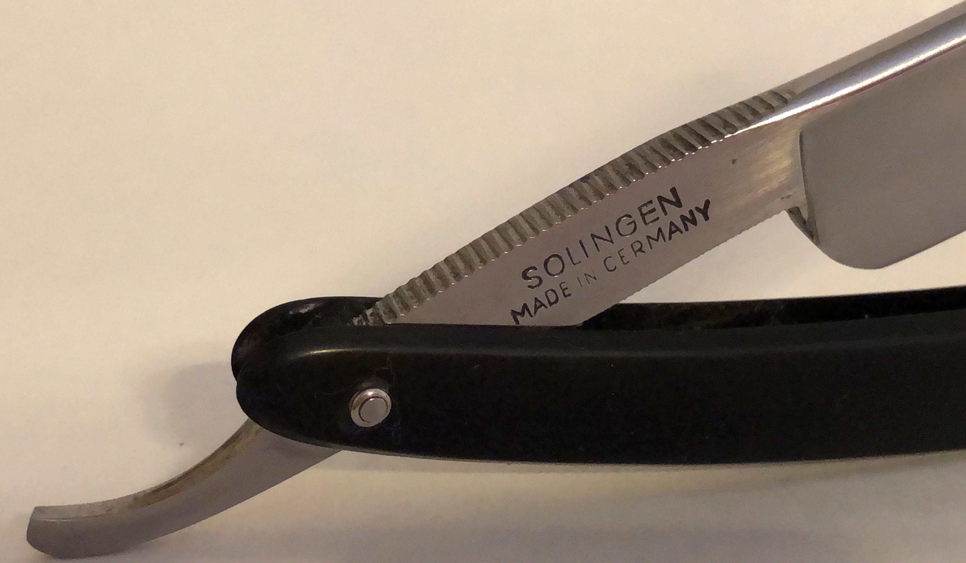 Бритва была разобрана, чтобы удалить небольшое количество окисления в районе осевого пина и немного патины с полотна.Оригинальные пины поменял на немецкие двух-цветные втулки.Идеальная геометрия клинка. Кромочка равномерна по всей длине.Заточена и готова к бритью.