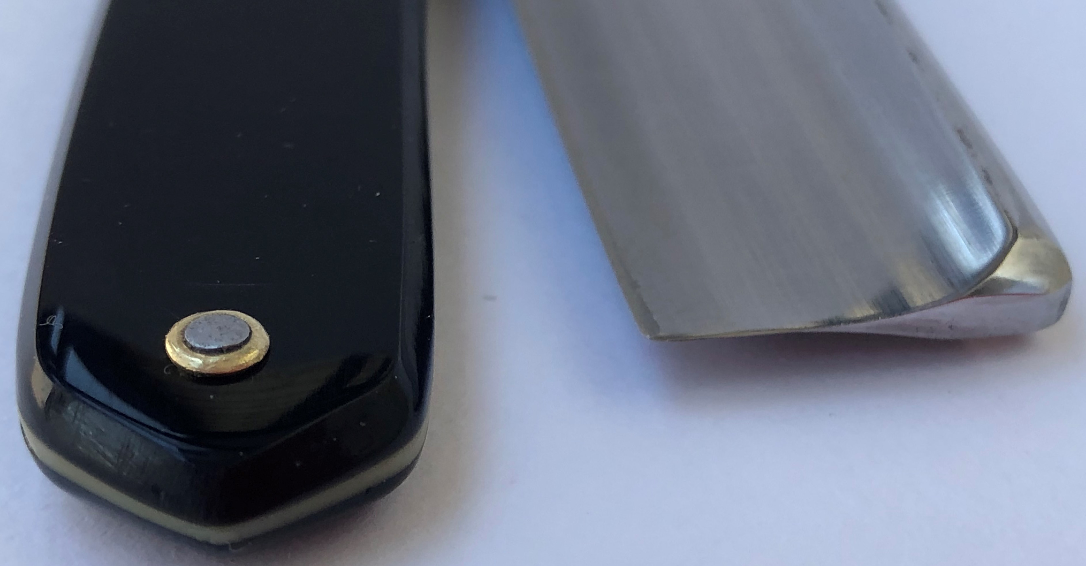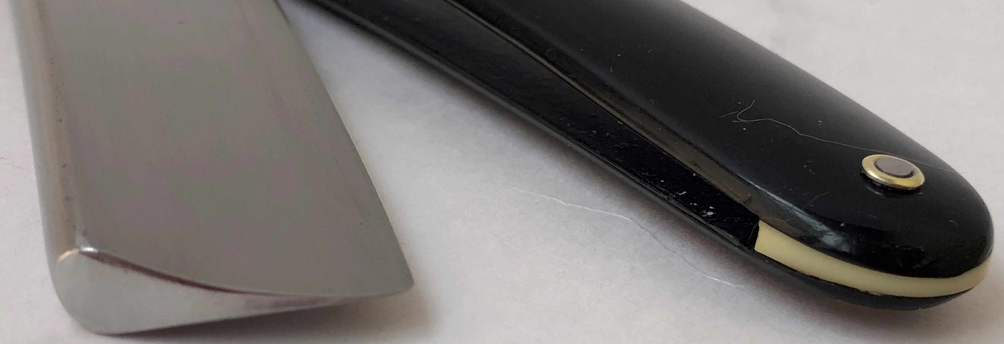 Ширина полотна-21 мм. Толщина обушка-5.9 мм. Форма лезвия-1/2 клина. Серебряная шведская углеродистая сталь. Примерно 50-60-е годы прошлого века. Бритва в очень хорошем и малопользованном состоянии. Разобрал, немного освежил металл клинка и снова собрал, с заменой пинов на немецкие втулки. Идеальная геометрия полотна:кромочка равномерна по все длине.Сталь и кромка чистые от разного рода видимых дефектов.Эффектная ручка"под черепаху".Тяжёлая, но за счет своего укороченного полотна верткая бритва, под разные задачи.Не часто сейчас встречаются укороченные японцы, так что не пропустите. Цена-11500 р с доставкой. ПРОДАН Spoiler Show Spoiler Show