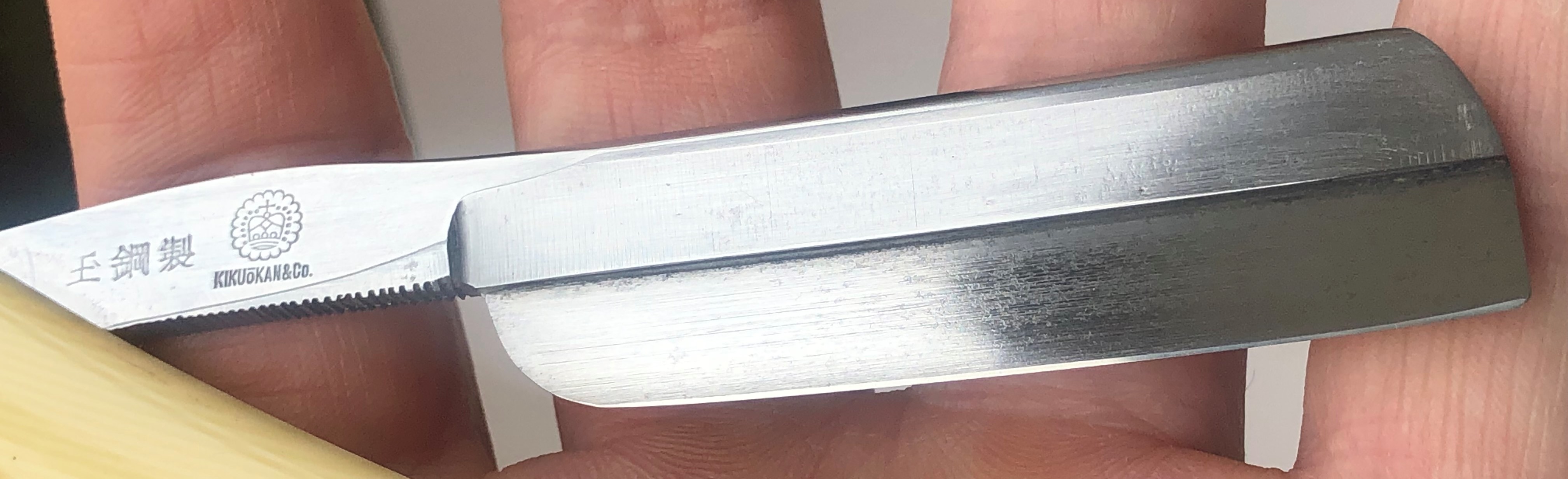 Сегодня хочу представить шикарную пару японских бритв Kikuōkan 1000,с волшебным иероглифом на эрле-玉-ТАМАХАГАНЕ. Это как раз тот случай, когда всем известная сталь на клинке, но ценник приемлемый, в отличие от, например бритв Ивасаки тамахагане, либо других брендов, где стоимость исчисляется тысячами долларов. Ширина полотна-21.5 мм. Толщина обушка-6.2 мм. Форма лезвия-фреймбэк. Углеродистая сталь тамахагане. Примерно 50-60-е годы прошлого века. Обе бритвы находятся в прекрасном и малопользованном состоянии, с красивой патиной на клинке, что очень хорошо подчеркивает старинный налет времени на инструменте.Бритвы были разобраны и умеренно отполированы , чтобы убрать избыточную лишнюю патину.Но, сами клинки имеют оригинальный, заводской вид.Эффектная ручная(на камнях)продольная шлифовка самой пластины бритвы также присутствует.Идеальная геометрия на обоих полотнах:кромочка равномерны по всей длине.Высококачественная и всеми желанная сталь тамахагане очень хорошо точится, доводится и способна выдавать бритье,близкое к эталонному. Одна из бритв уже заточена и лично протестирована.Все на очень высоком уровне,без вопросов. Цену буду указывать в долларах,до тех пор, пока ситуация с рублем до конца не устаканится. Цена-400$ за ШТ, с заточкой и доставкой.(оплата рублями, по курту ЦБ). ОБЕ ПРОДАНЫ Spoiler Show Хотел бы обратить внимание, что на мировом рынке такие бритвы(их очень мало представлено) стоят порядка 800 $, так что не пропустите и сохраните свои средства. Внимание! Важная информация! Spoiler Show