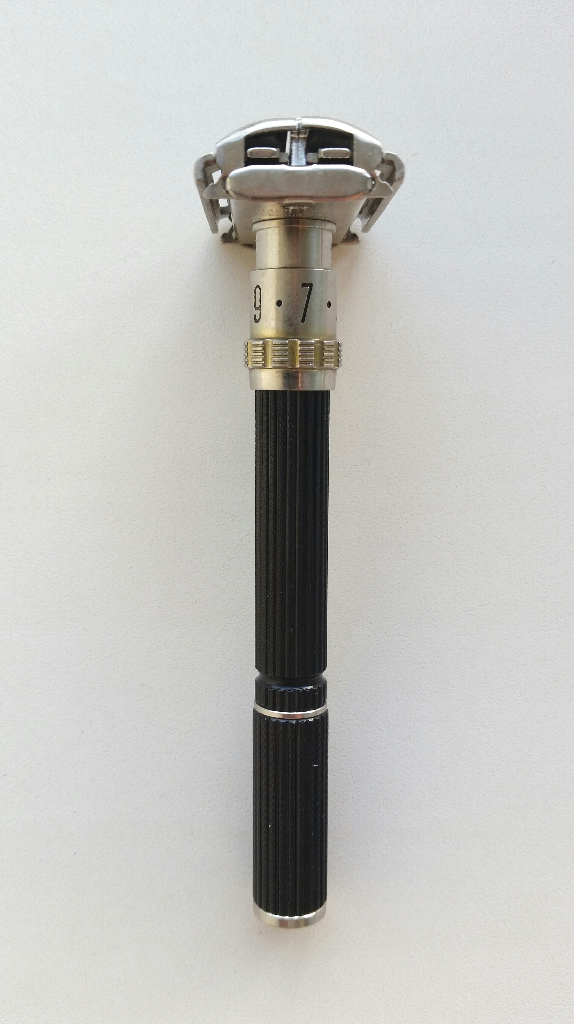 Регулируемая безопасная бритва Gillette Adjustable, США, 1973 год (код Т-2), конструкция "бабочка". Black Beauty (Черная Красавица), можно сказать легенда, более ранняя версия с металлической опорной плитой. Станок почистил, внутри и снаружи. Механизм смазал индустриальным маслом, чтобы все крутилось веселее. Механика отличная, мягкое открытие, работают все регулировки. Цена - руб. Spoiler Show