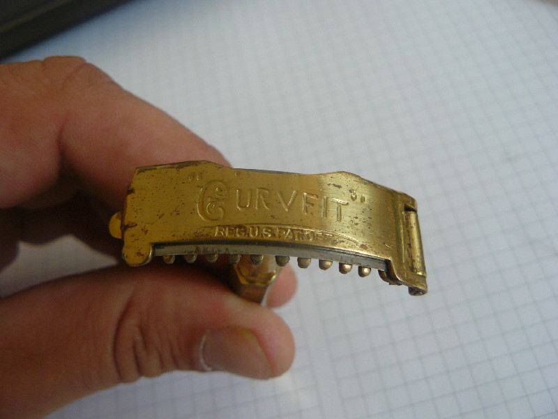 Curvfit-Безопасная бритва для Леди. Старинная позолоченная безопасная бритва для леди. Используется специальное одностороннее лезвие. Первоначальной выпуск в 1920-ых годах. Curvfit Sales Corp., 33 Джефферсон-Стрит, Стамфорд, Коннектикут.
