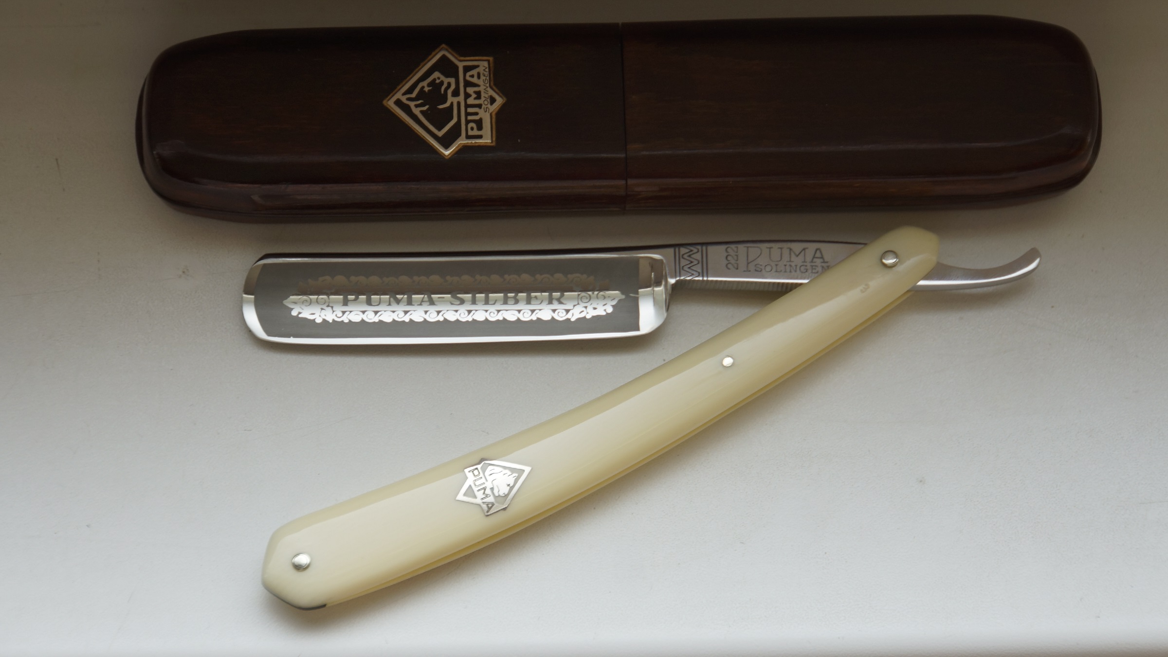 Производитель: Lauterjung & Sohn, Puma-Stahlwaren Германия, г. Золинген Ручка из целлулоида, с металлическим логотипом. Состояние на фото. Бритва заточена и готова к бритью. В комплекте также родной футляр. ПРОДАНО 10) Puma No. 1938, 5/8 Show