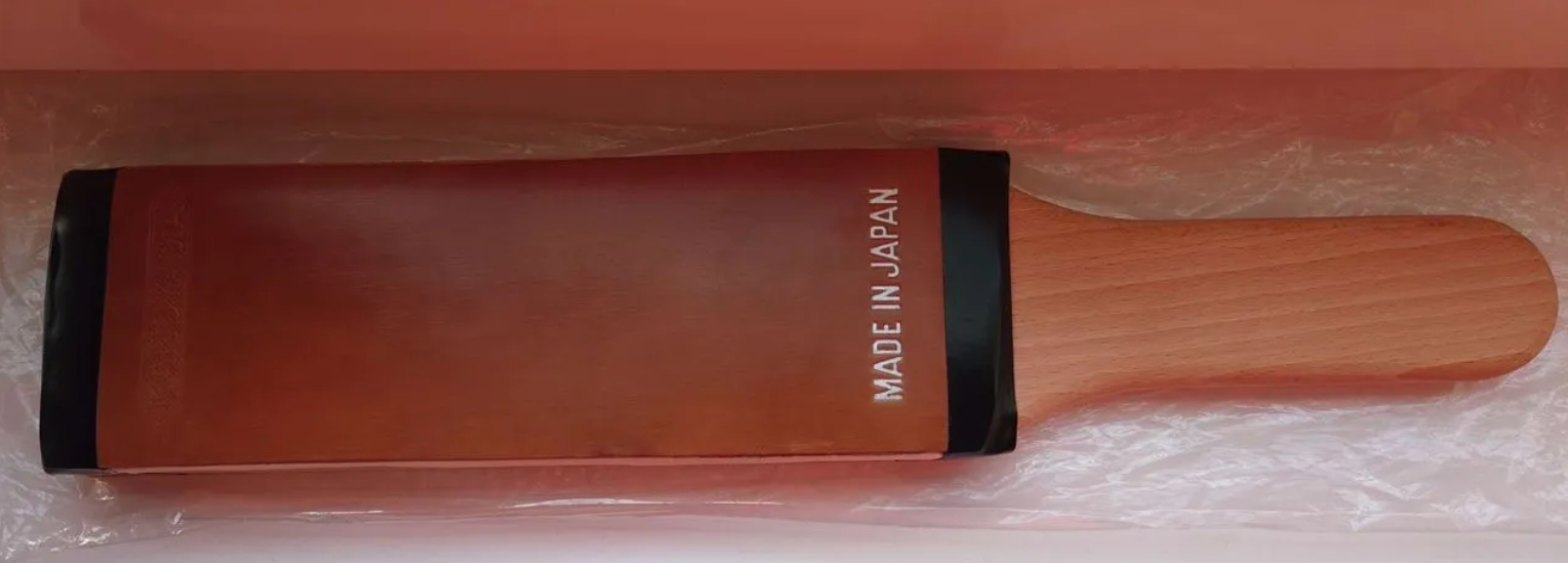 Производитель: Kanayama Razor Strop Co. Япония, г. Токио. Японский ремень для правки опасных бритв, на деревянном основании. Лицевая сторона из кордована, обратная сторона из замши для предварительной правки. Под лицевой частью имеется амортизирующая мягкая подложка. Ремень новый, в использовании не был. ПРОДАНО 12) Kanayama Show