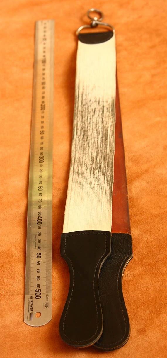 ну с первым понятно, очень неплохой ремень, от неизвестного американского производителя, годов эдак 60-х прошлого столетия, а вот по второму никакой информации найти не смог, с одной стороны кожа на которой вытеснен текст Echt Wild-Juchten (кто такой дикий Juchten, Google переводчик не обьяснил :) ), а с другой стороны наклеена древесина и надпись которая гласит Garantiert echt Aloe (что это натуральное алоэ) и судя по внешнему виду эта сторона очень интенсивно использовалась, после правки на сем чуде стала брить даже "упрямая " СТИЗовская Двухзаковная.