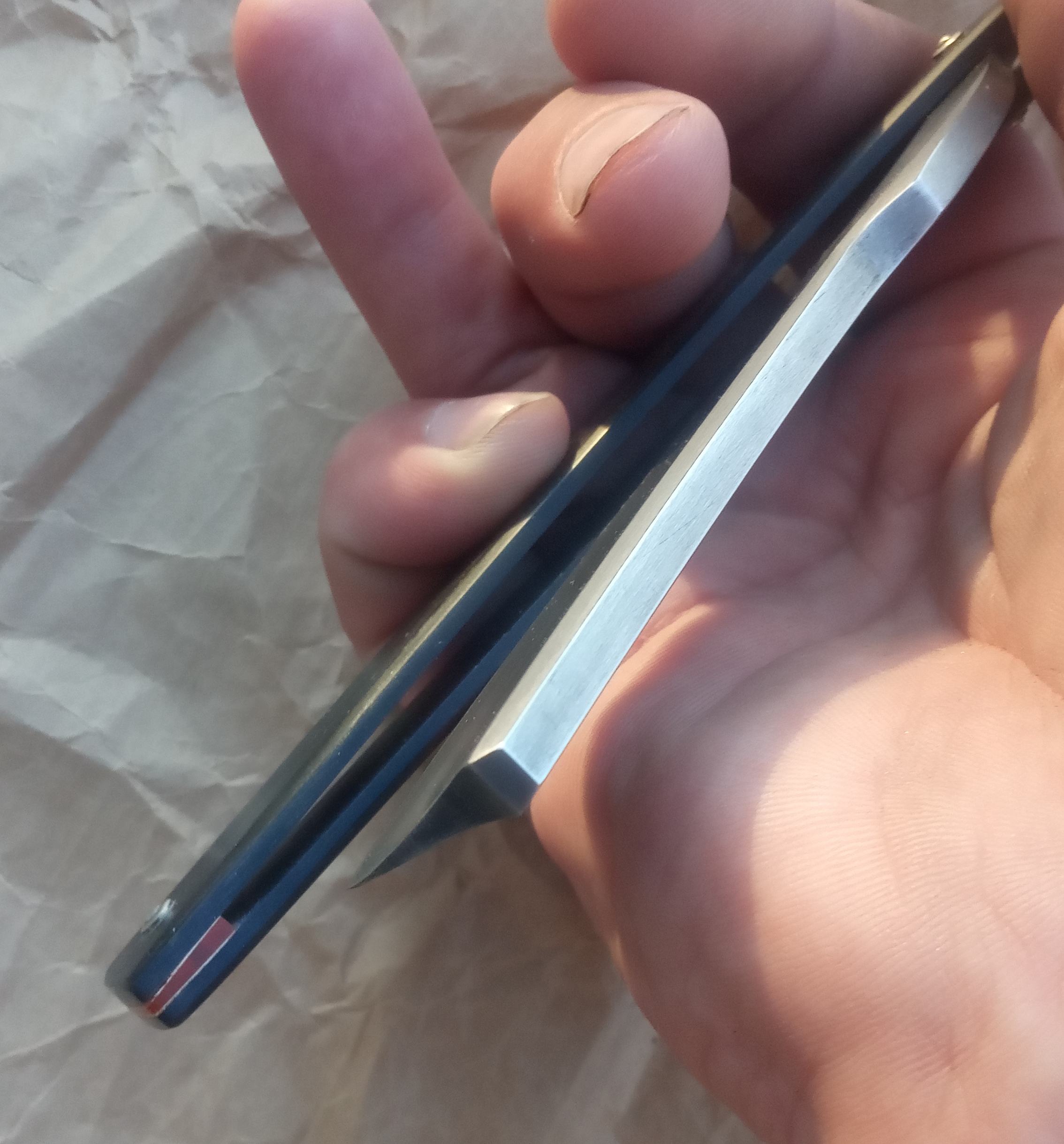 Мечтаю изготовить бритвуВот и сбылась мечта... Мой первенец многотрудный. Напильник У12 разрезал. Был доступ к гриндеру. Ободрал контуры и грубые спуски. Отправил на термичку. Зонная закалка в шестьдесят HRC. Потом самые прикольные моменты работы на колен. Станочка пока нема и обдирал дрелью с лепестклвым диском (дураков работа любит). Получил 3/4 клин 22мм. Обух от шести мм на сужение. Оправу поставил из смолы собственной заливки. Заточил. Пока не опробовал