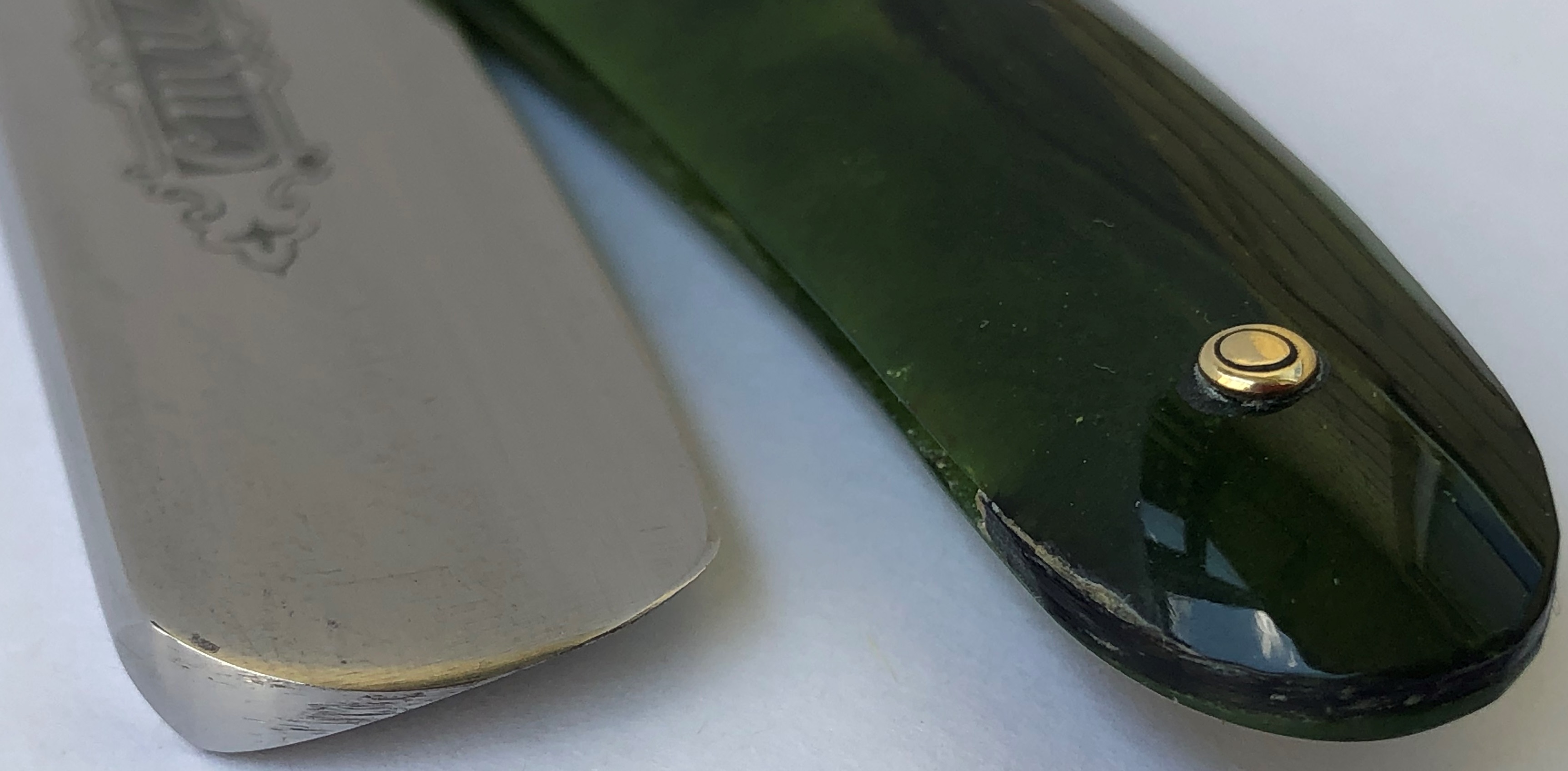 Бритва в идеальном и непользованном состоянии. Ничего не разбиралось и не ремонтировалось.Все как вчера с завода.Оригинальная шлифовка и полировка клинка.Идеальная геометрия полотна:кромочка равномерна по всей длине.Шикарная оправа из натурального рога. Третий средний пин надежно держит оправу от деформации.Ажурный и эффектный обушок.