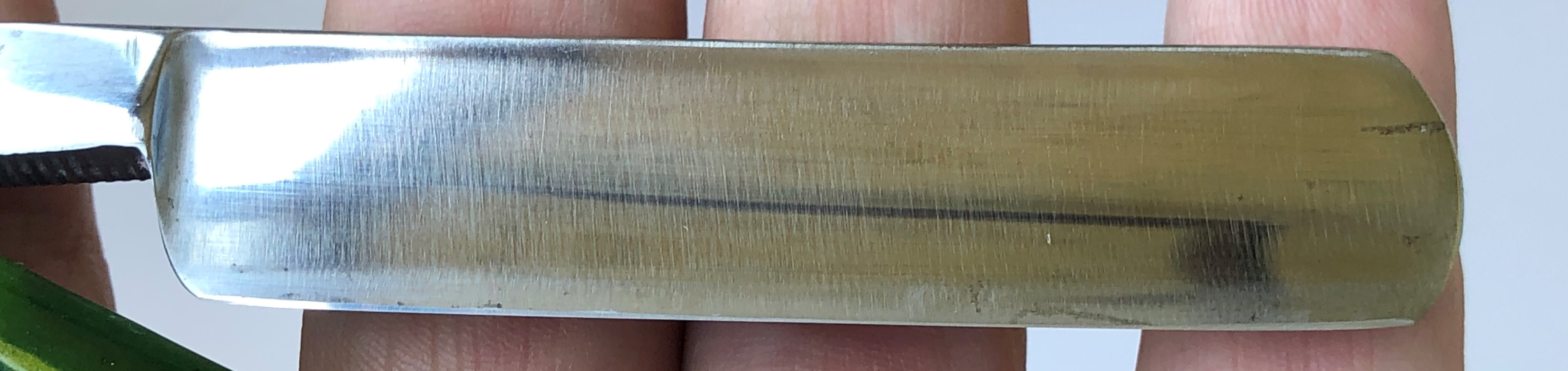 Бритва в очень хорошем состоянии. Реставрация клинка от Frans, новая роговая оправа тоже от него. Мои доработки также присутствуют. Хорошо сохраненная геометрия полотна.Кромочка равномерна по всей длине.Несколько мм у пятки не проточено, чтобы не испортить клинок камнями.Эффектный граненый обушок. В общем и целом красивая французская классика, в отличном и боевом состоянии. Заточена и лично протестирована. Все на очень приличном уровне.