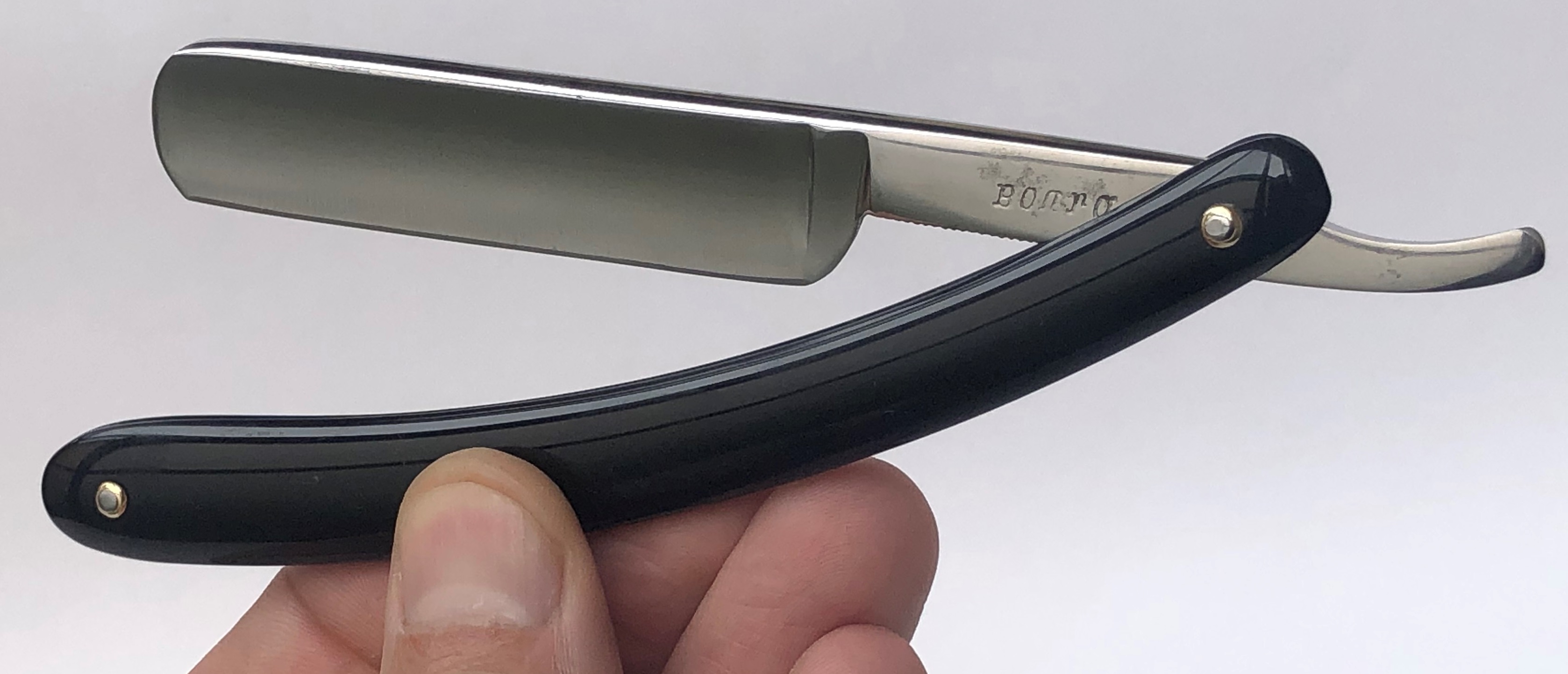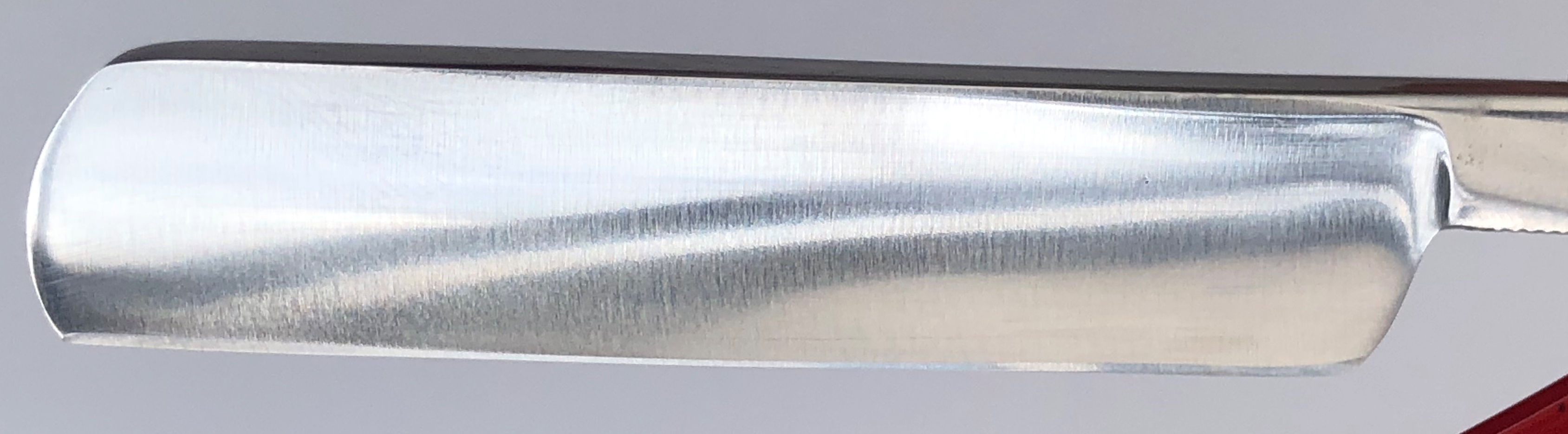 Само полотно на несколько мм укорочено.Было немного освежено от патины, с повторением "родного" характера шлифовки и умеренной полировки.Идеальная геометрия клинка. Сталь чистая, без видимых дефектов.Очень приятная во всех отношениях бритва, достаточно недорогая и если бы не укороченное полотно, то цены бы ей не было...