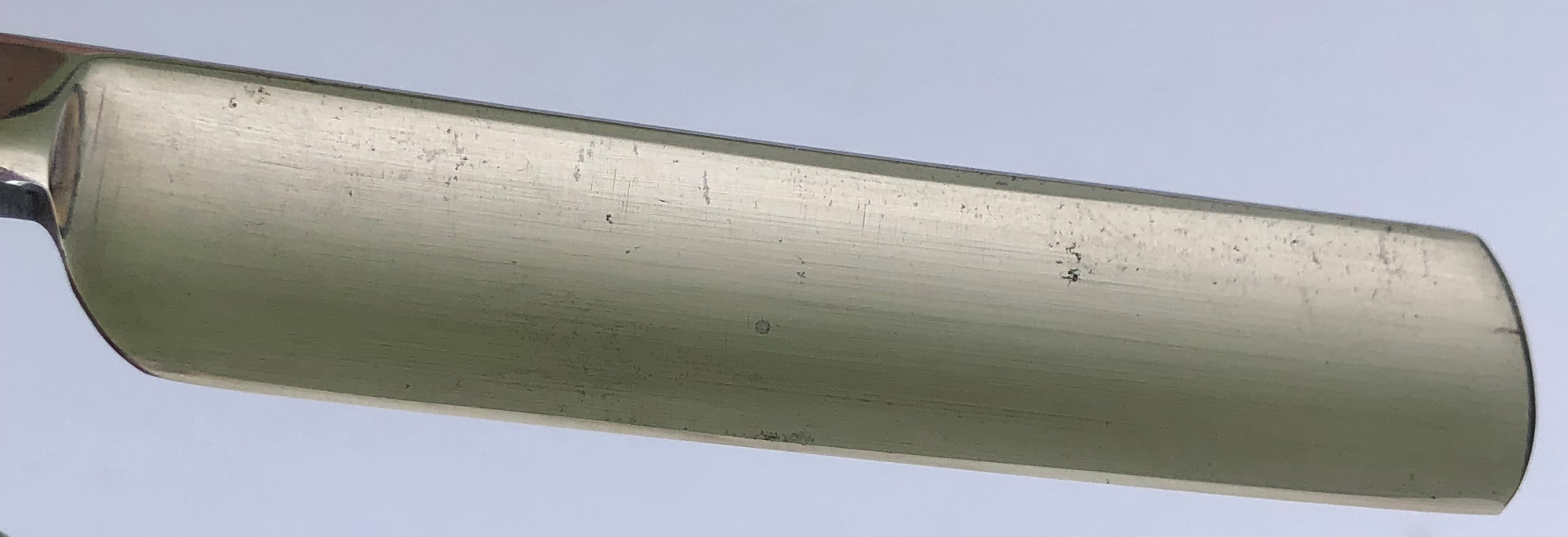 Кто бритву реставрировал и шлифовал полотно, мне не известно. По всей видимости бритва не разбиралась.Шлифовка аккуратная,кромочка ровненькая.Не стал ничего разбирать и чистить в районе осевого пина, но следы времени никоим образом не повлияют на процесс эксплуатации.
