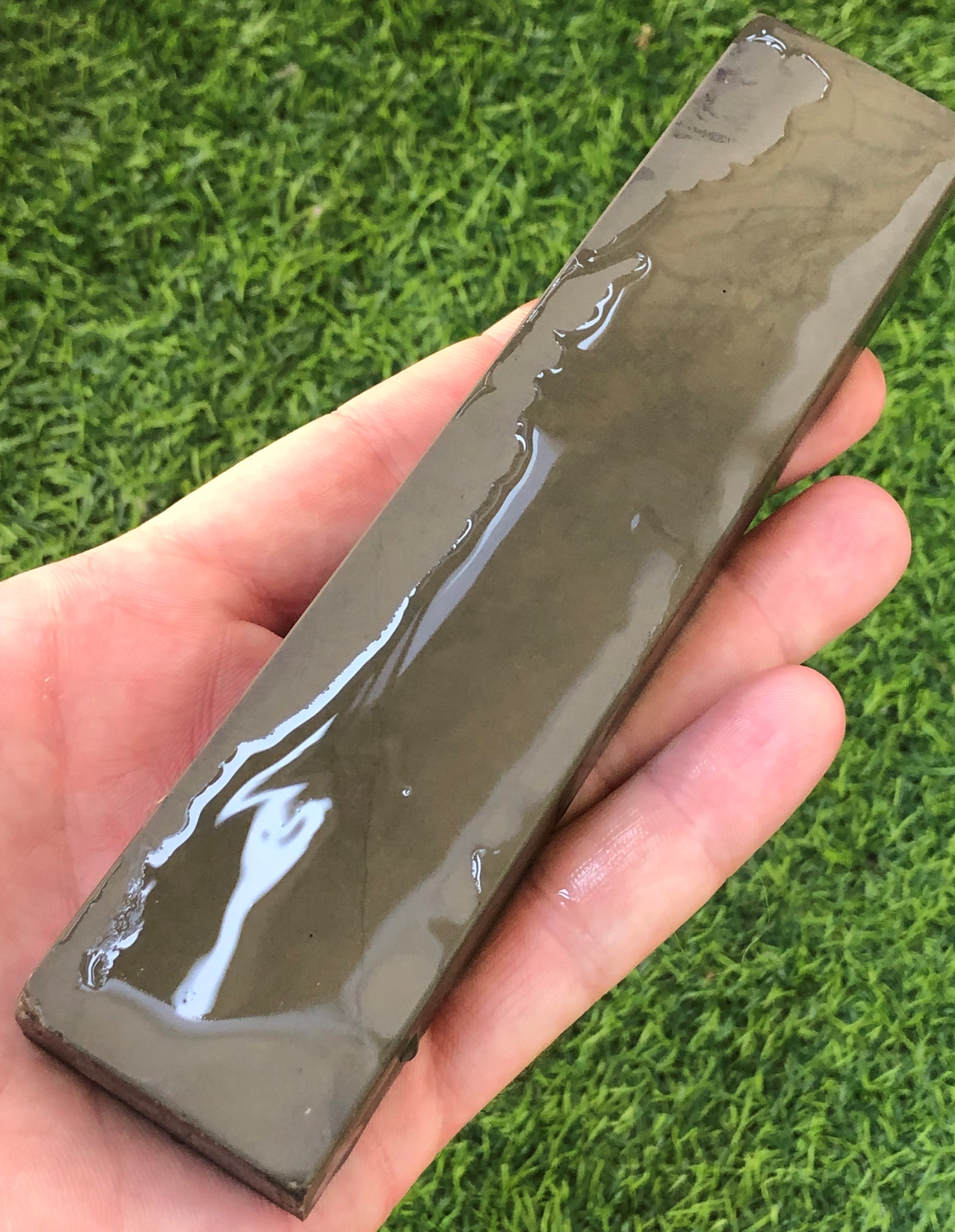 На торце осталась этикетка цвета:темно-синий. Стачала я подучал, что этикетка не родная, но если внимательно посмотреть, то камень представляет собой природно срощенные два слоя:темный оттенок переходит в самый качественный и быстрый(в плане работы) желто-зелёный цвет. Такие двух-слойные образцы можно увидеть на самых топовых и безумно дорогих камнях-barbers delight или "восторг парикмахера".Можно сказать, что за цену обычного 7-дюймового Эшера получаем редкий камень премиум класса.