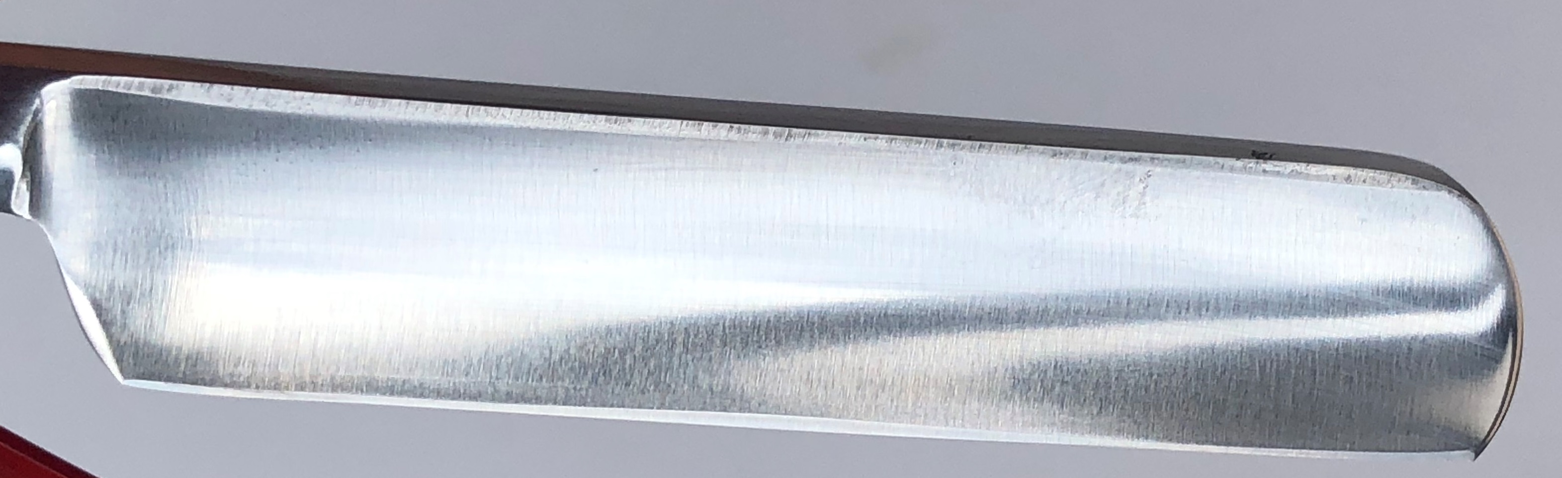 Само полотно на несколько мм укорочено.Было немного освежено от патины, с повторением "родного" характера шлифовки и умеренной полировки.Идеальная геометрия клинка. Сталь чистая, без видимых дефектов.Очень приятная во всех отношениях бритва, достаточно недорогая и если бы не укороченное полотно, то цены бы ей не было...