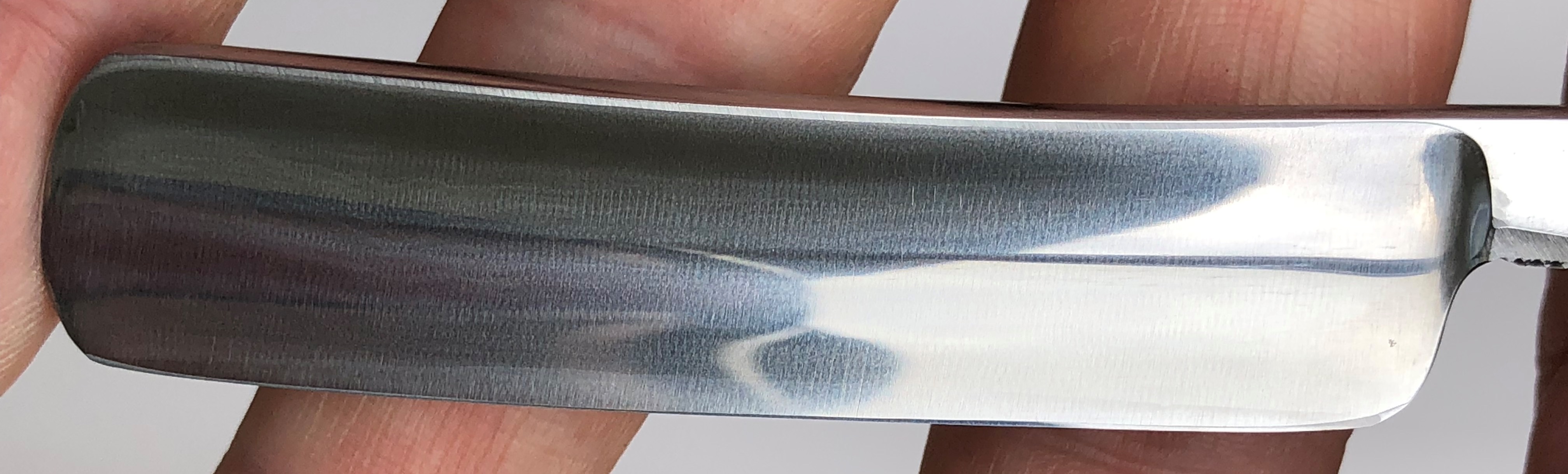 С большой долей вероятности могу сказать, что бритва именно советская и не рукодельная, а именно изготовлена на производстве.Забыл сделать фото оригинальных пинов, но те пины что стояли до косметических работ были именно как на Вачах и Стизах до и после военного периода. Т.е. медные расклепанные штифты, без шайб.По крайней мере я не помню, чтобы на импортных бритвах кто то и когда то ставил такие штифты, а не пины.Оправа напоминает Вачские и Стизовские бритвы 40-х годов, а сама форма клинка, с такой парикмахерской выемкой, очень похожа на стизовский "Спорт", а "горбатый" обушок на "Спартак".С другой стороны я специально сделал фото насечек на клинке, где они выполнены не так четко, как на заводских советских бритвах.За 10 лет мне попадалось несколько безымянных советских бритв, произведенных вот так качественно , а никак не кустарно.Сужу с точки зрения заточника, что качество стали ничем не отличается от качества советских бритв 40-х годов.Такая же плотная, тяжёлая и не сухая в заточке углеродка. Идеальная геометрия клинка:кромочка равномерна по всей длине.