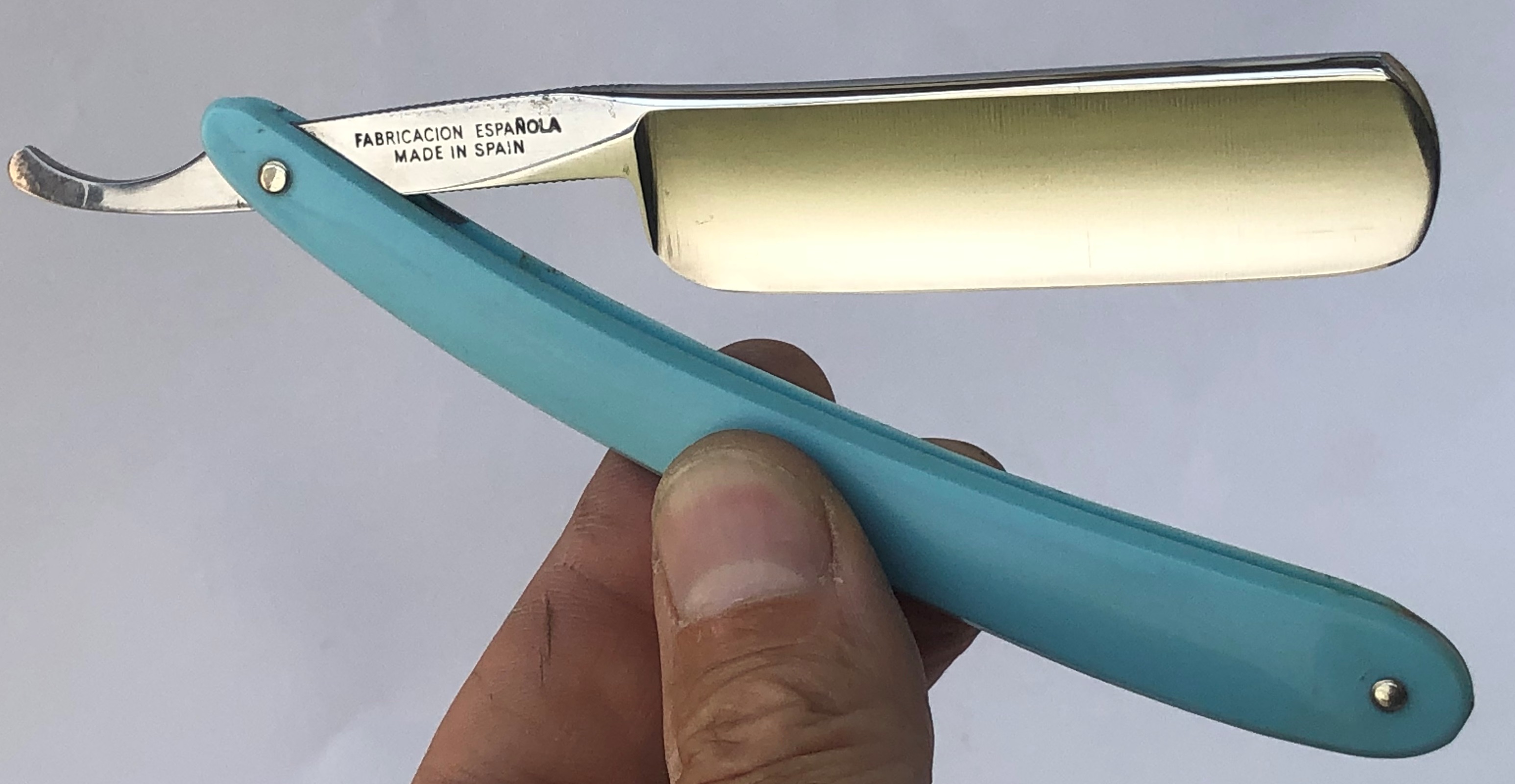 С большой долей вероятности могу сказать, что бритва именно советская и не рукодельная, а именно изготовлена на производстве.Забыл сделать фото оригинальных пинов, но те пины что стояли до косметических работ были именно как на Вачах и Стизах до и после военного периода. Т.е. медные расклепанные штифты, без шайб.По крайней мере я не помню, чтобы на импортных бритвах кто то и когда то ставил такие штифты, а не пины.Оправа напоминает Вачские и Стизовские бритвы 40-х годов, а сама форма клинка, с такой парикмахерской выемкой, очень похожа на стизовский "Спорт", а "горбатый" обушок на "Спартак".С другой стороны я специально сделал фото насечек на клинке, где они выполнены не так четко, как на заводских советских бритвах.За 10 лет мне попадалось несколько безымянных советских бритв, произведенных вот так качественно , а никак не кустарно.Сужу с точки зрения заточника, что качество стали ничем не отличается от качества советских бритв 40-х годов.Такая же плотная, тяжёлая и не сухая в заточке углеродка. Идеальная геометрия клинка:кромочка равномерна по всей длине.