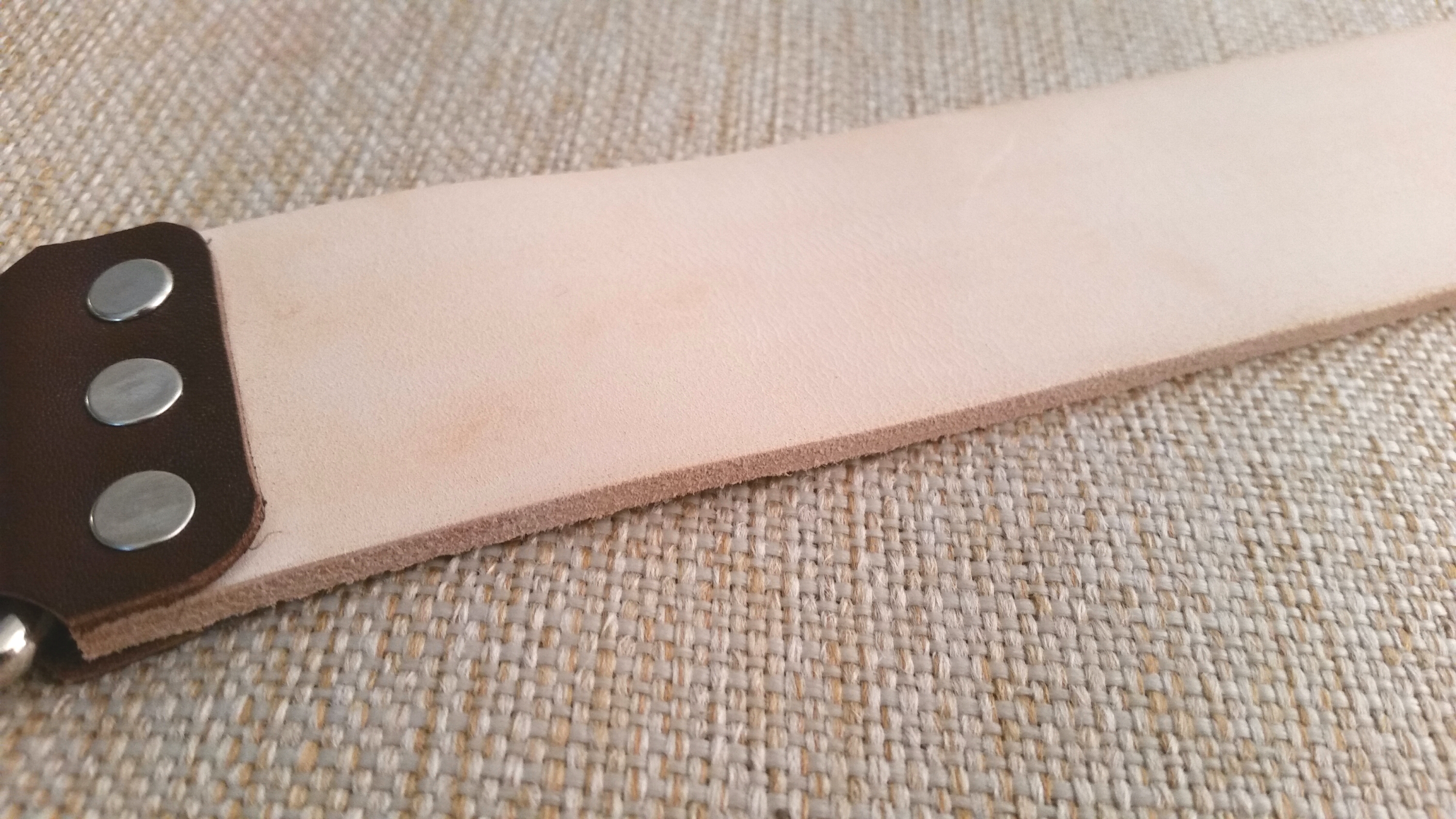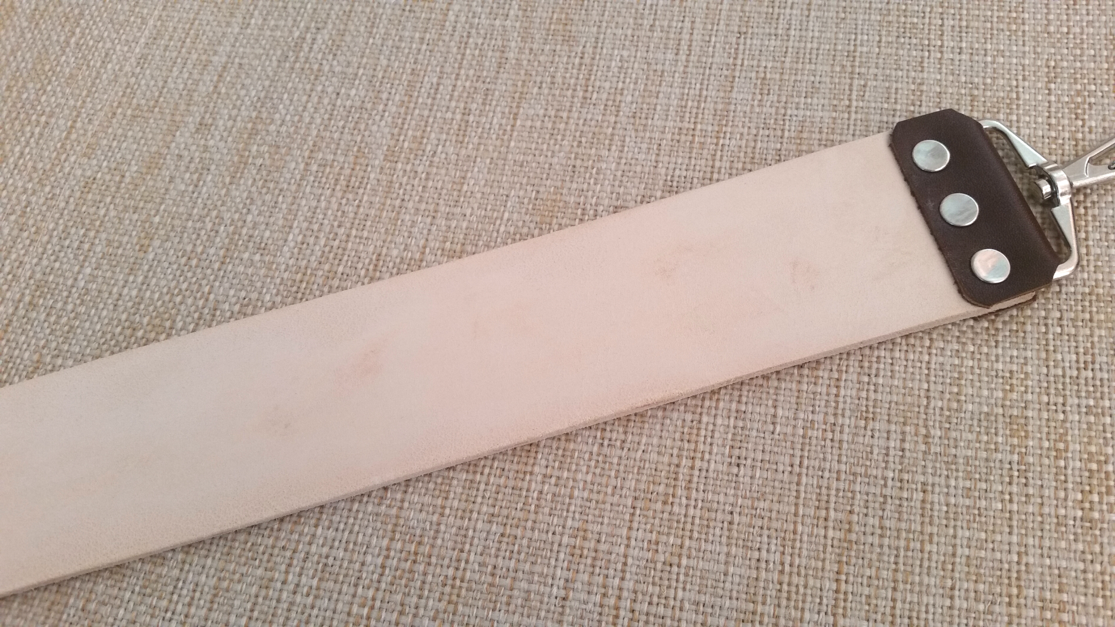 Ремень для правки, шириной 51 мм, уцененный. Длина стандартная (50 см), толщина кожи 3.4 мм, кожа итальянская КРС растишка. Из боковой части чепрака, где изначально кожа была с нарушениями. В нижней части есть морщины, есть желтоватые участки, но кромка бритвы и ладонь проходит без ощущений, править будет (хотя, лучше бы он подошел для ножей). Обработан, смазан костным маслом, готов к правке, поверхность тактильно чуть шершавее, чем на стандартных моих ремнях. Цена - руб. Spoiler Show