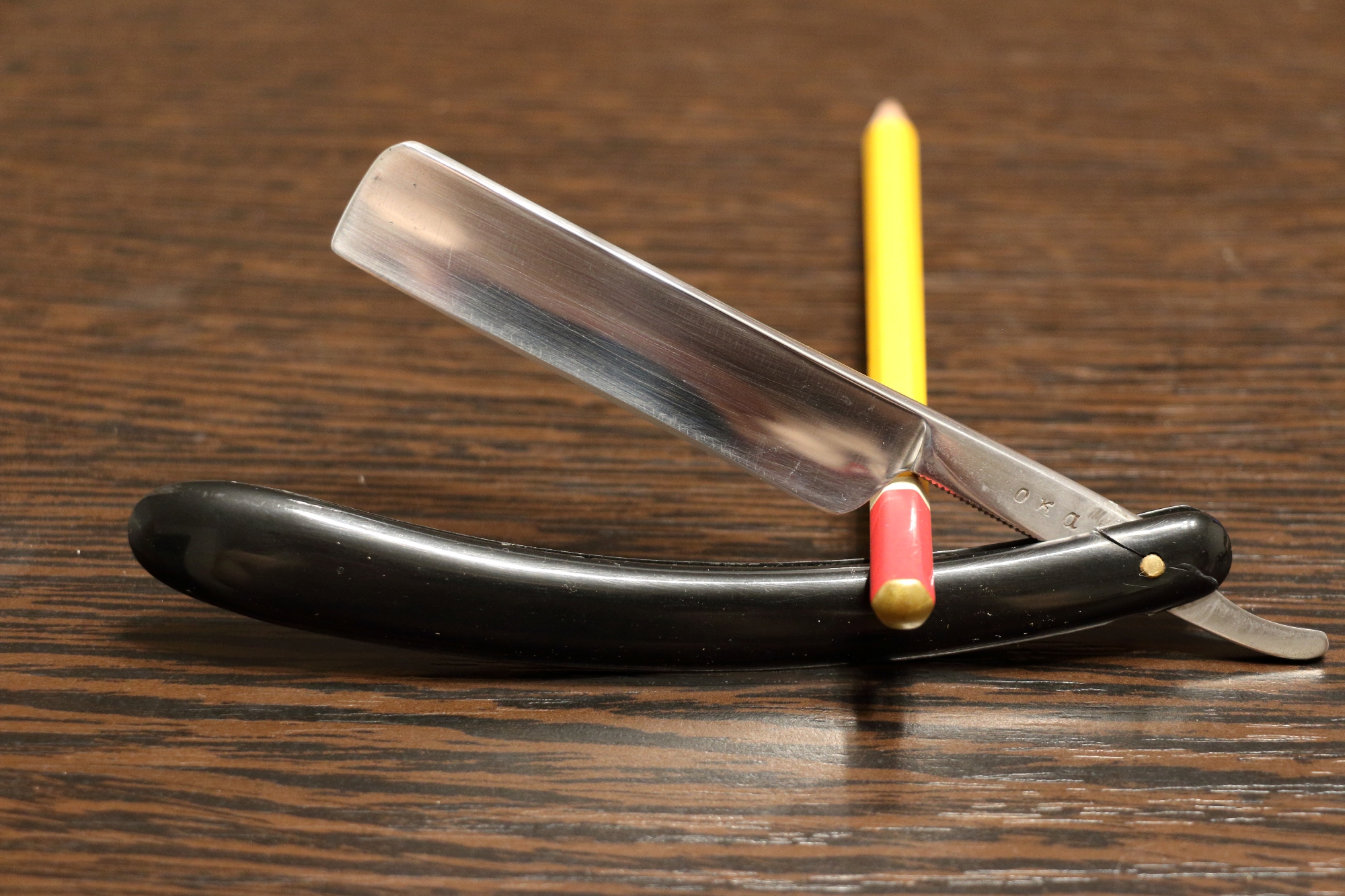 Опасная бритва Ока, завод ЗТВ (Вача), 1956 год. Ширина полотна 18.1 мм, все родное, футляр тоже. Бритва попала ко мне с заводской заточкой и в достойном виде (разве что была коррозия на эрле), вручную почистил и заточил. Подготовлена мной к бритью. Есть трещина в районе осевого - проклеил. Отличная бритва из водной серии, куда еще входили Кама, Волга, Яхта. Качественная твердая сталь, клинок массивный. Бритвы ЗТВ второй половины 50х почти всегда выделяются приличным качеством. Цена 4000 руб.