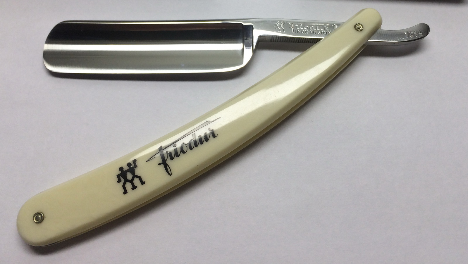 Zwilling J.A. Henckels AG, Solingen 6/8 Модель 72 1/2 Friodur Inox No stain Germany Нержавейка с обработкой жидким азотом. Мягкая. Подойдет новичкам. Хорошо пойдет под борд с пастой. Состояние идеальное (не могу написать что NOS так как не я вскрывал) Но даже ветхая бумажка на месте. Сложно оценить возраст. Лэйбл говорит что моложе 80 лет. Бумажка истлела как на все 60-80 лет (трухлявая и с запахом библиотеки) Но пластиковая коробочка смущает. (как сейчас помню что году этак в 2000 видел такие в магазинах и слюни пускал. Но ручки у бритв были уже более грубые. Так что по факту думаю годов 90-х а м.б. и 80-х Цена 9000