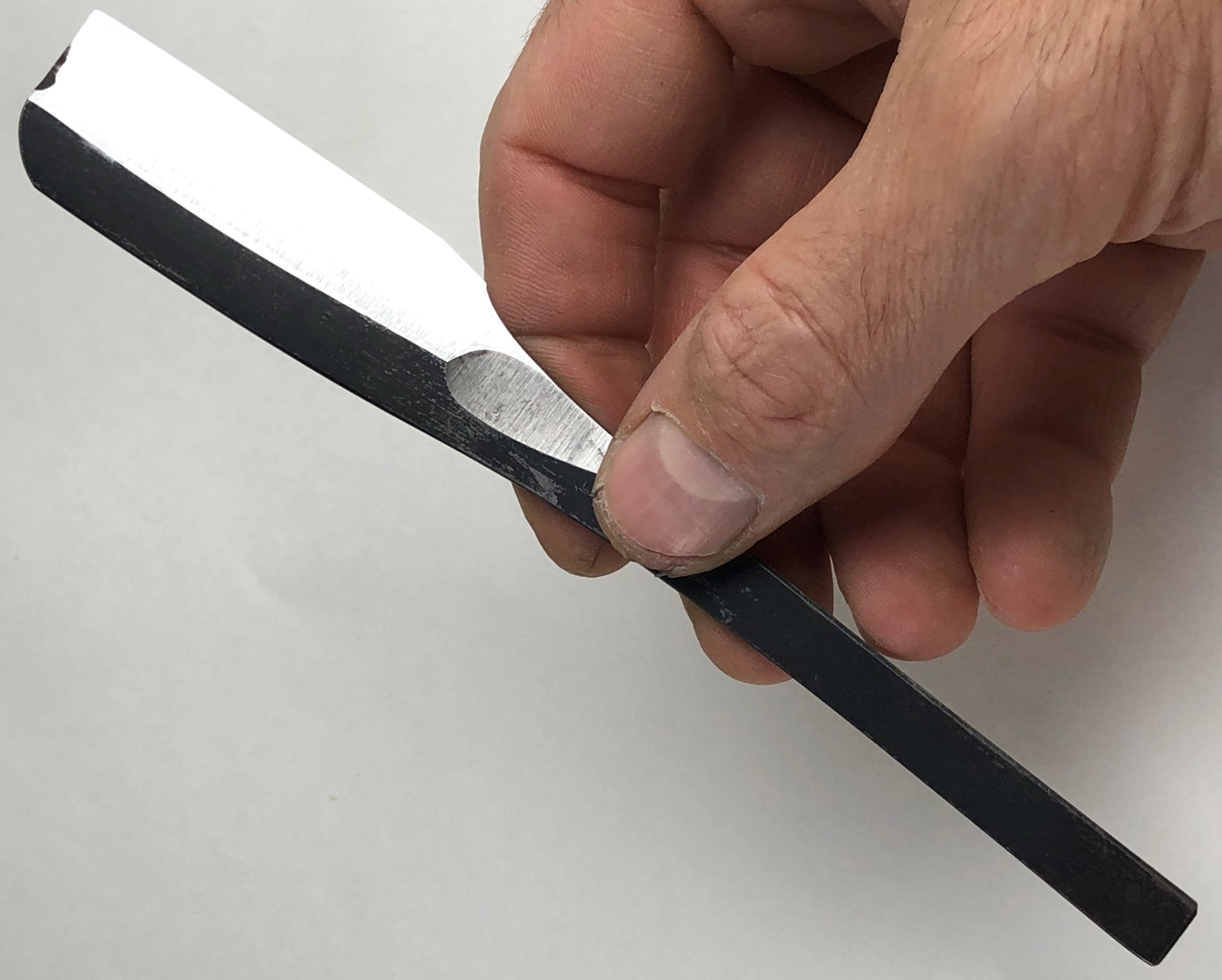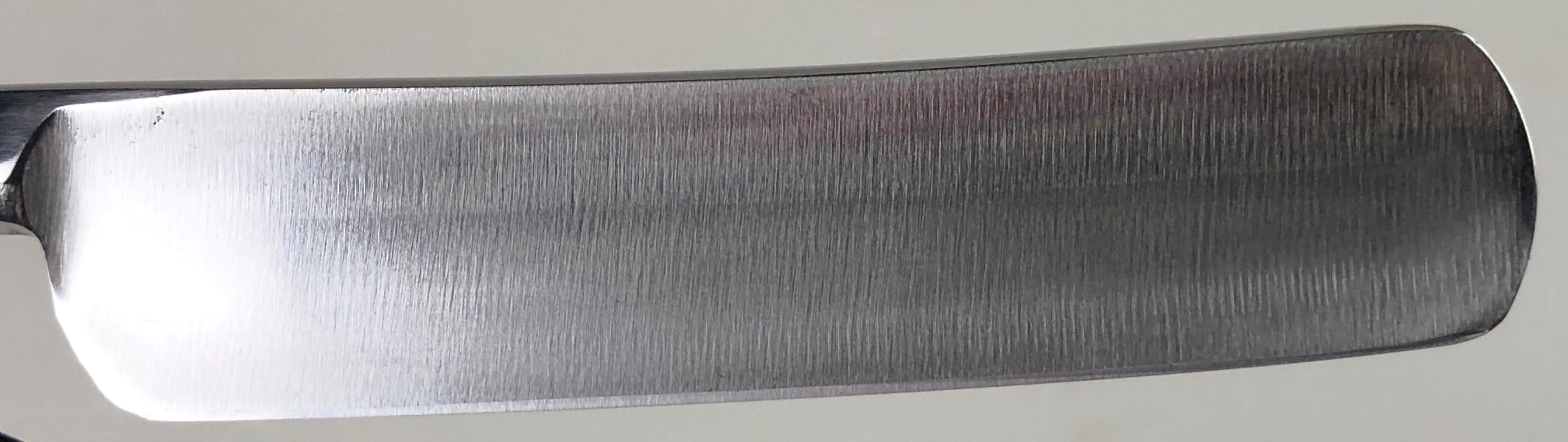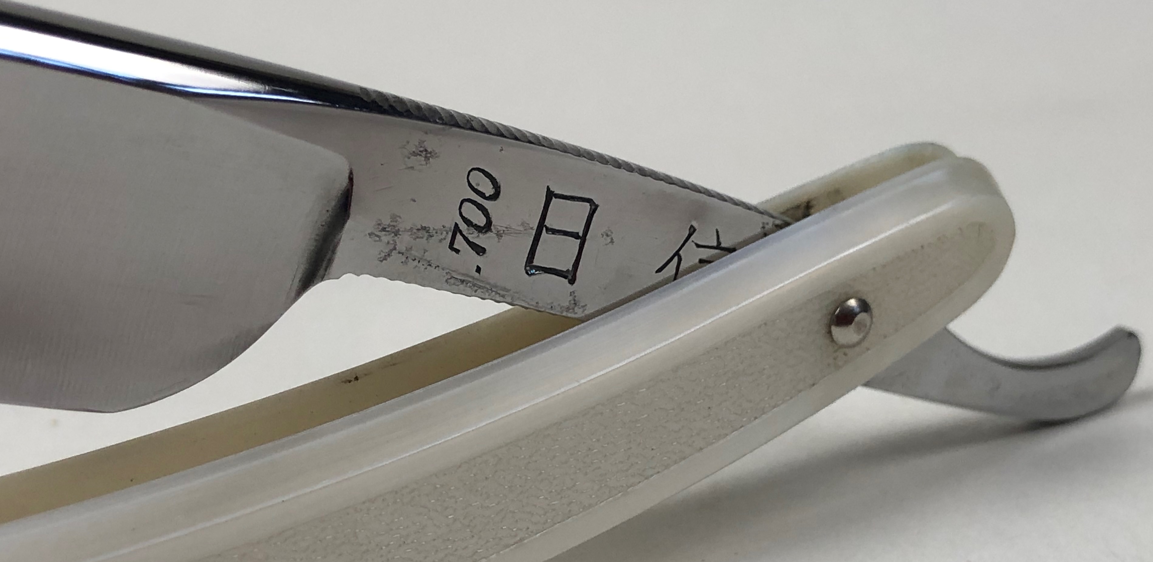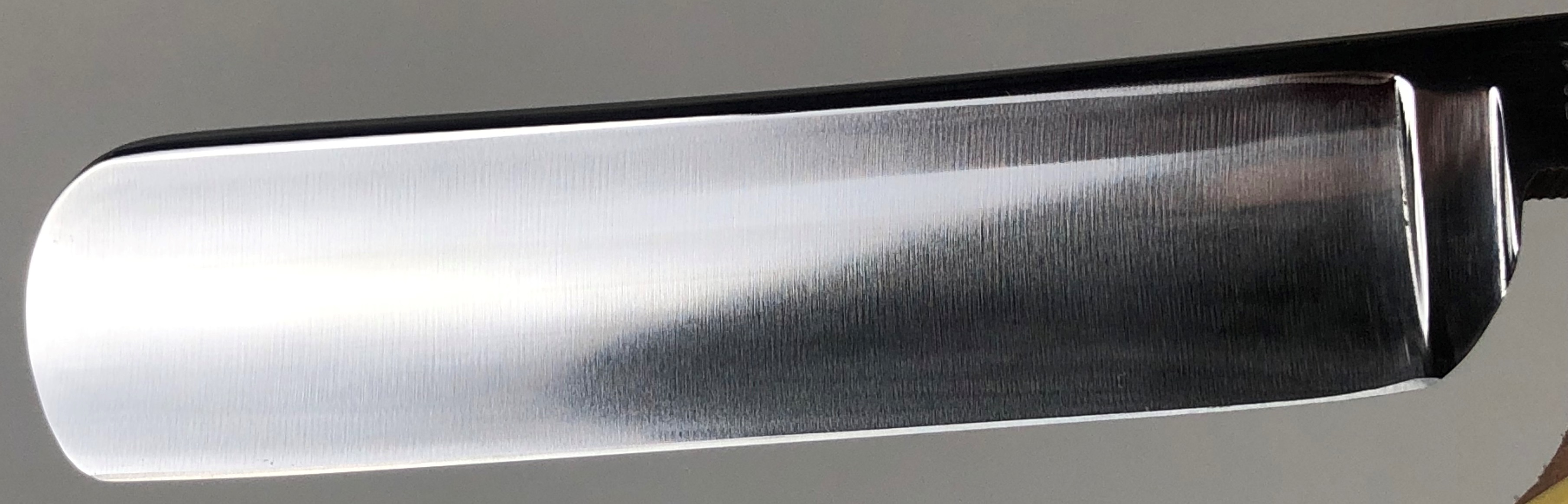 Бритва с минимальными следами пользования.По всей видимости была заточена однажды, а потом просто доводилась на финишниках.Сторона "ура" имеет прекрасную многолетнюю патину.Сторона "омоте" оригинальный грубый гринд.Идеальная геометрия изготовления. Кромочка на "ура" равномерная и еле заметна.На "омоте" шире, но также равномерна по всей длине.Сама сталь Тамахагане каким то магическим образом привлекает всех любителей японской Бритвы и заставляет искать по всему миру то, что сейчас еще где то осталось от этой самой известной семьи.С бритвой ничего не делал, а только тряпочкой протер, как бы это смешно не звучало для многих посвящённых товарищей..