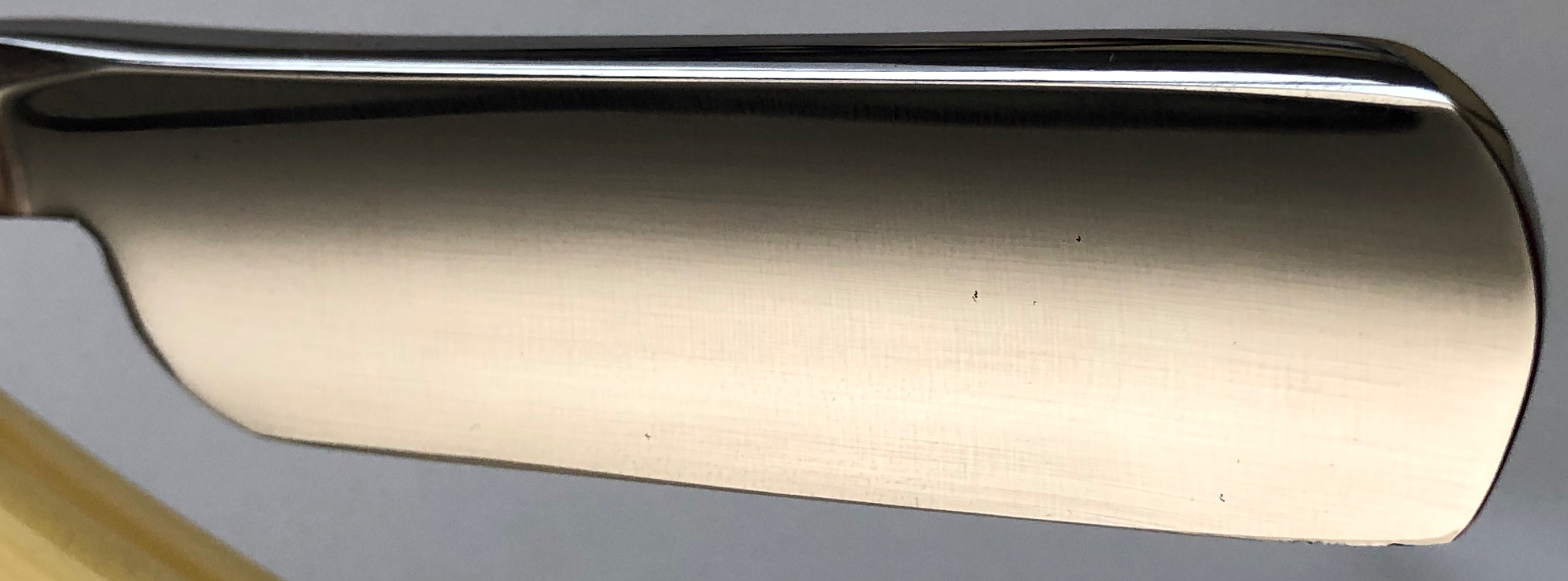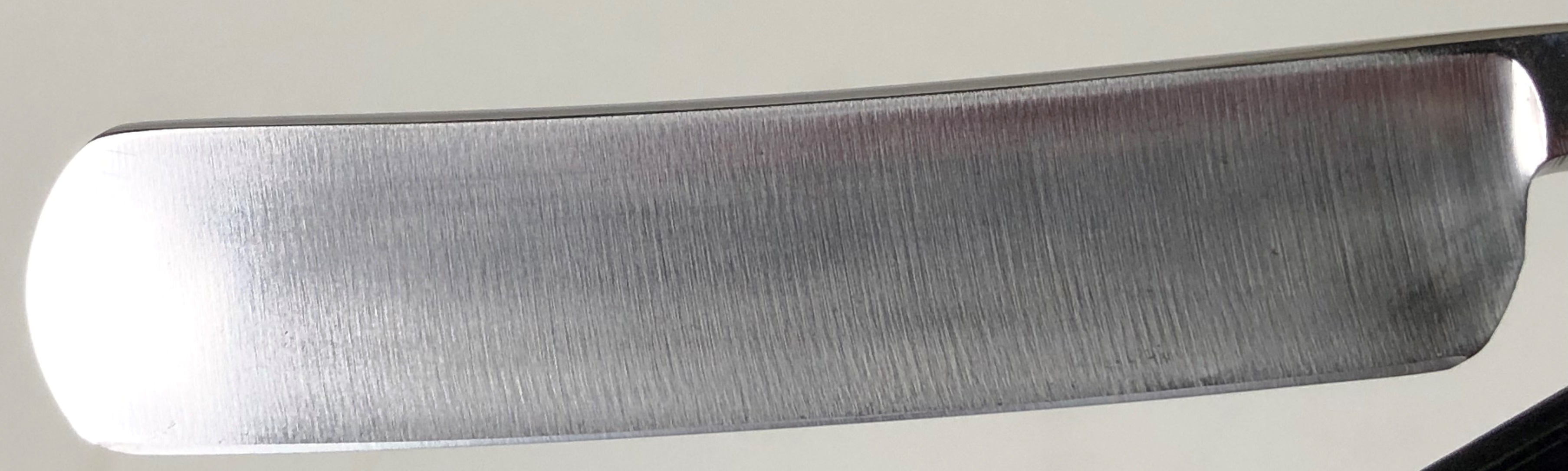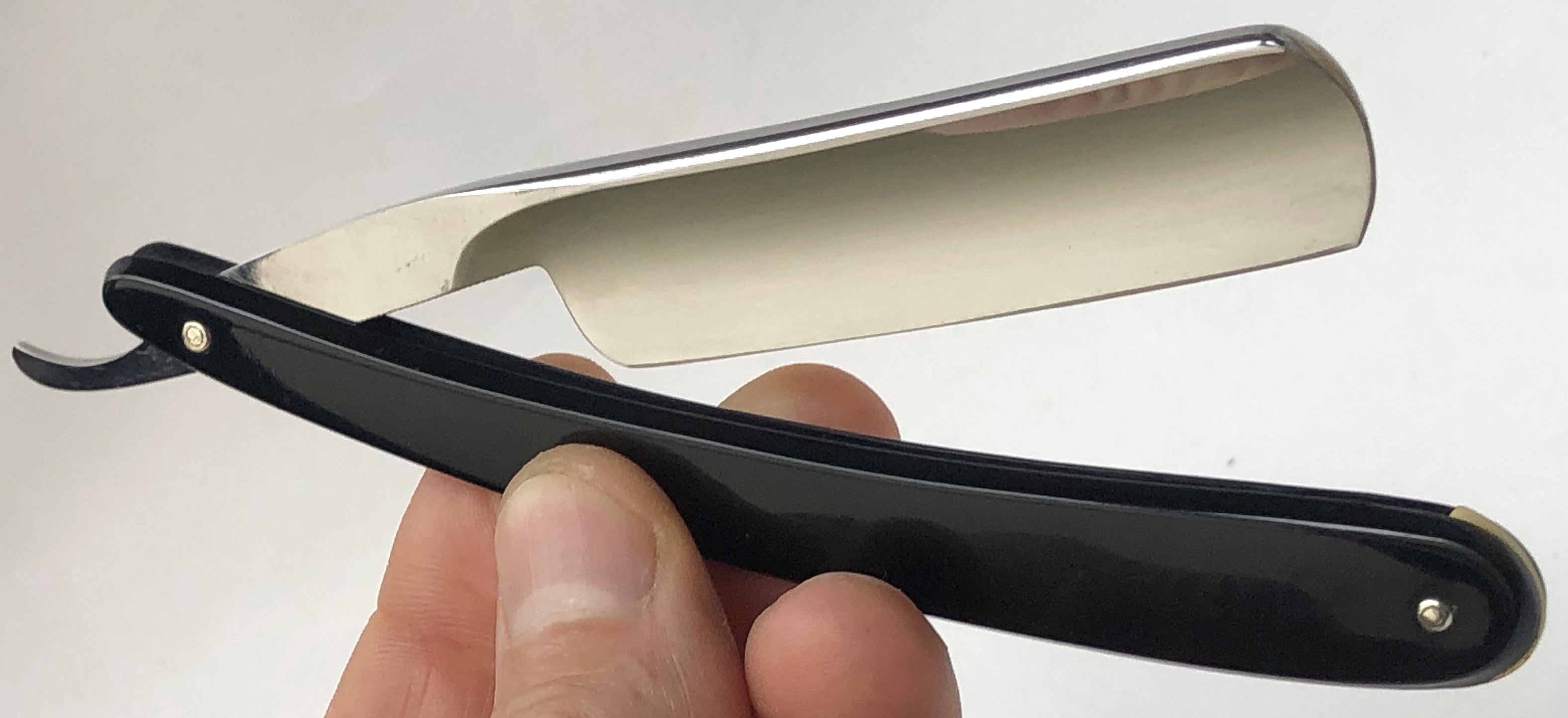Бритва совершенно непользованная,была оттерта от остатков старого масла с консервации.Ничего не разбиралось и не ремонтировалось.Заводская шлифовка и полировка.Бритву до конца не точил, а только сформировал кромку, чтобы посмотреть геометрию клинка. С геометрий тут все нормально:кромочка равномерна по всей длине.Сталь чистая, без видимых дефектов.Бритва хоть и среднего размера, но за счет толстого обушка достаточно тяжёлая, что даёт возможность чувствовать ее в руке , контролировать процесс и не резаться часто. Особенно это важно для новичков. Сама форма лезвия и размер бритвы хорошо подходят именно для новичка и обучения бритию.Укороченное полотно прекрасно справляется с труднодоступными местами.Перед отправкой будет заточена и доведена до комфортного бритья.
