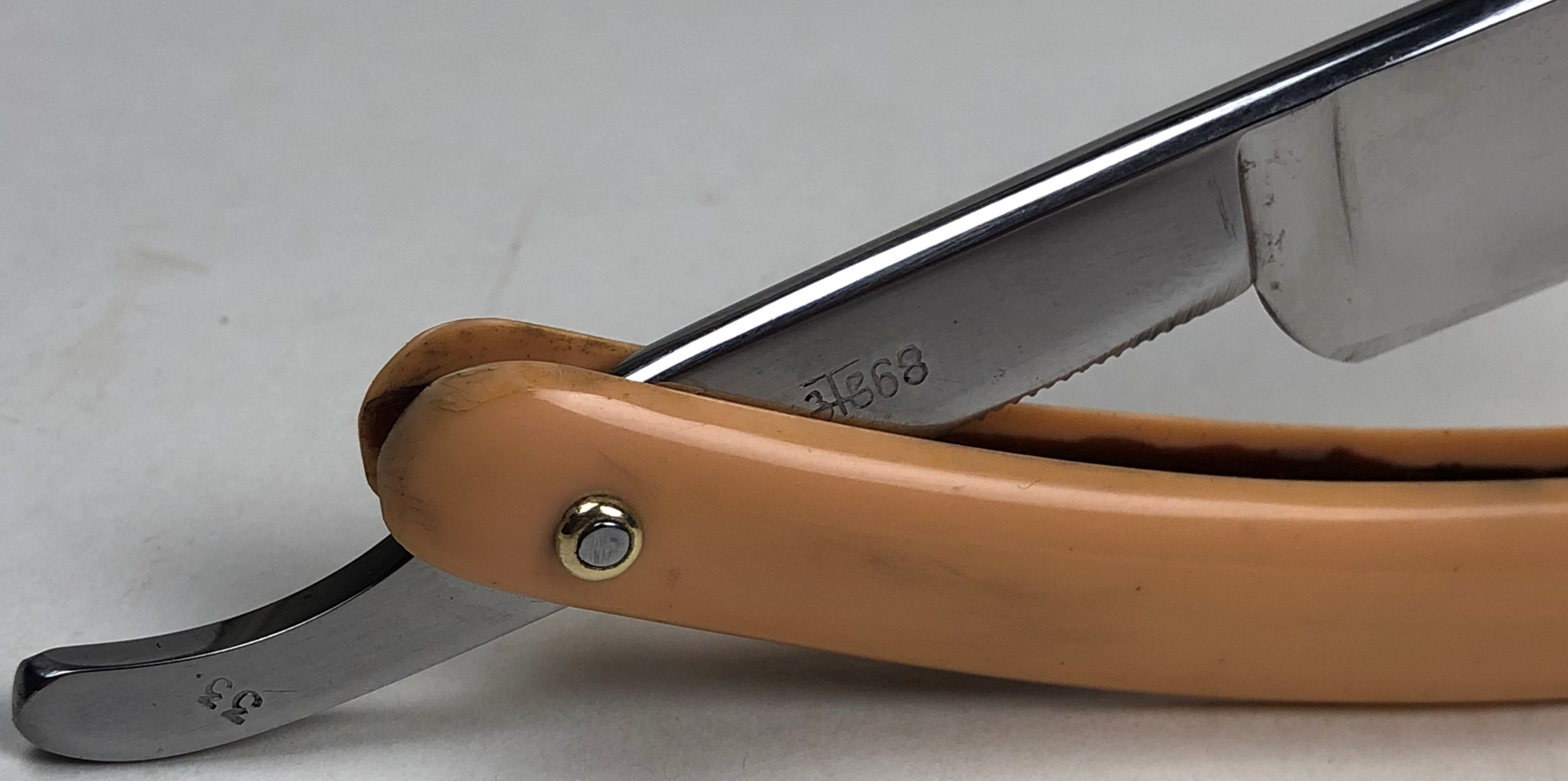Бритва в прекрасном состоянии, близкое к идеальному, с практически незаметными следами пользования.Заводская шлифовка полотна.Что характерно, обратная сторона полотна бритвы имеет продольную ручную шлифовку, по принципу традиционной японской шлифовки катаны. Бритва была разобрана,для замены пинов и добавления внутренних шайб, для надежности.Со своей стороны умеренно полирнул металл, для придания былого блеска. Идеальная геометрия клинка:кромочка равномерна по всей длине и практически незаметна. Эффектные двух-цветные пины.Красивый и еле заметный элемент налета патины, который хорошо виден на фото, но наяву практически незаметен, но придает бритве естественный вид для своего почтенного возраста.