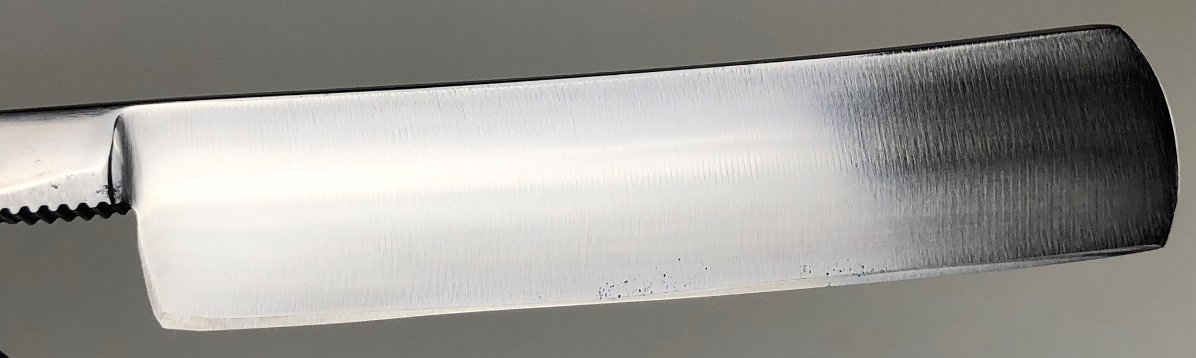 Бритва не разбиралась и не ремонтировалась.Без следов пользования. Оригинальная шлифовка. Полирнул немного, для восстановления былого блеска.Сталь чистая, без дефектов. Идеальная геометрия полотна.Заточена и готова к бритью. Совершенно бюджетный вариант для новичка.