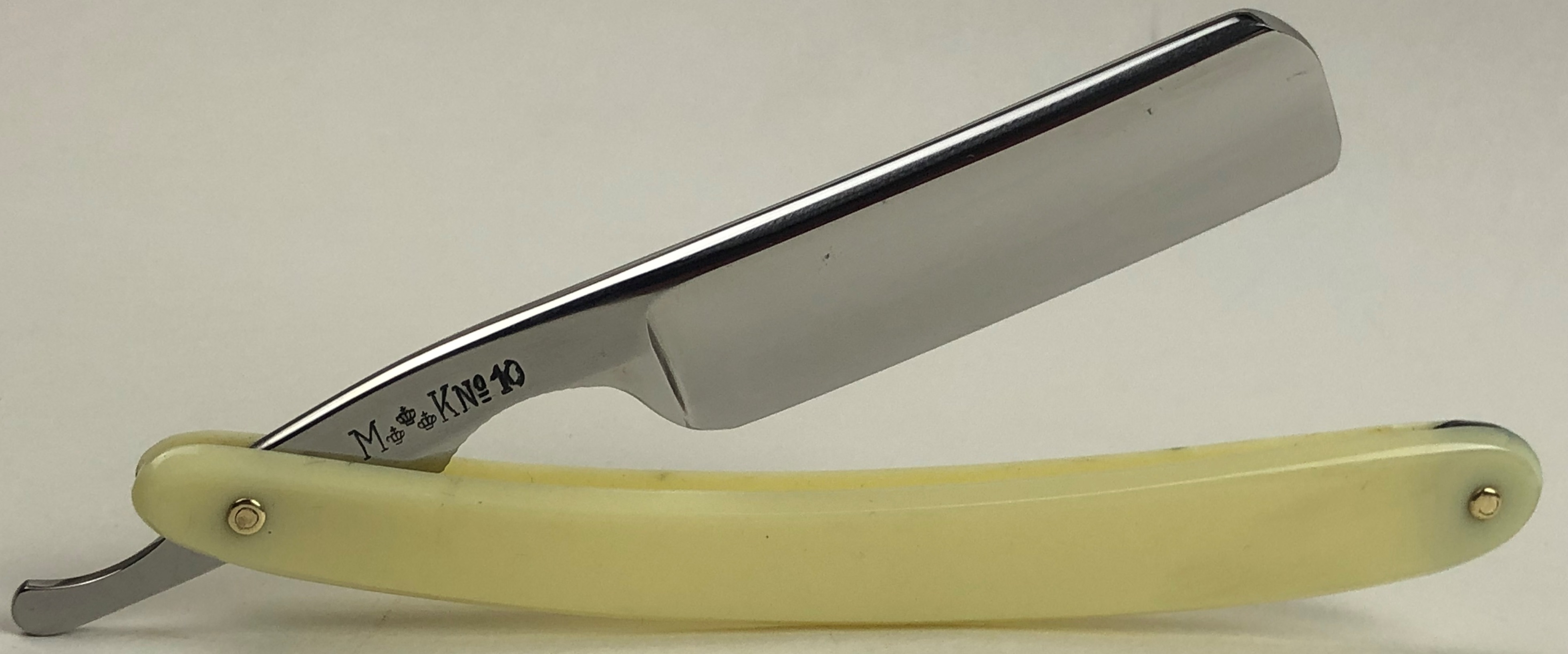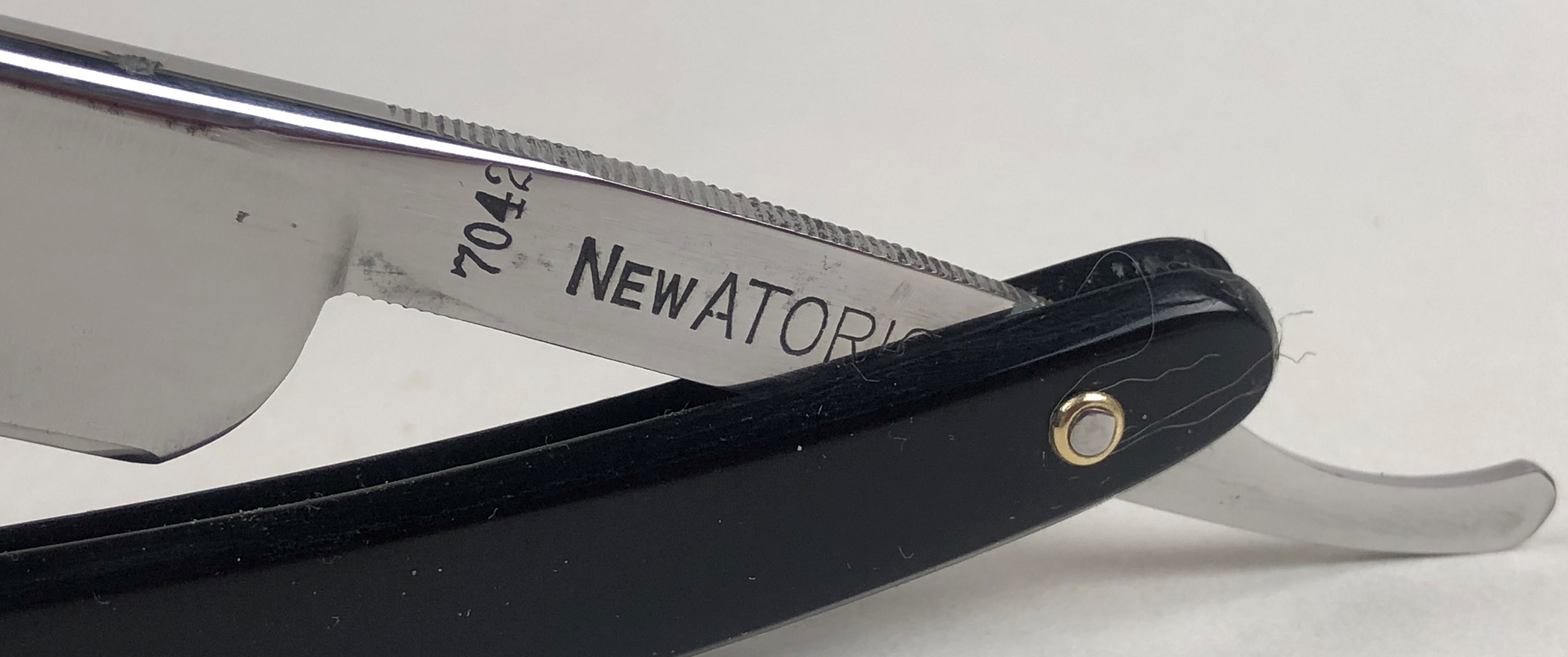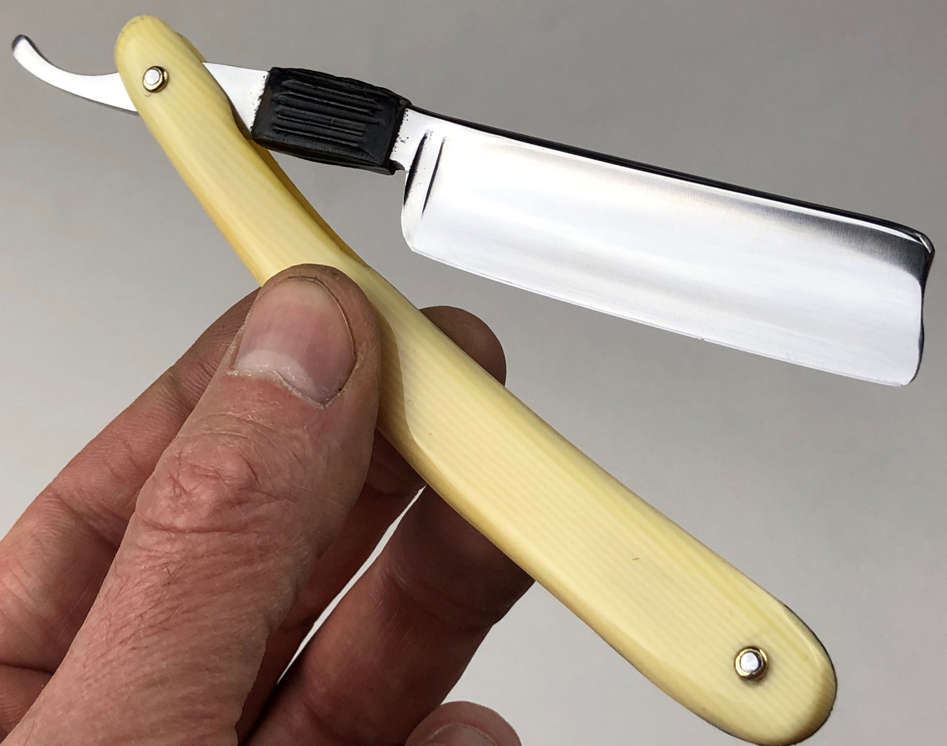Бритва в очень хорошем состоянии. Немного откорректировал утОчку обушка и умеренно отполировал клинок.Поменял пины на двух-цветные втулки и добавил внутренние шайбы.Идеальная геометрия:кромка ровненькая по всей длине полотна.Тяжёлая.Заточена и готова к бритью.