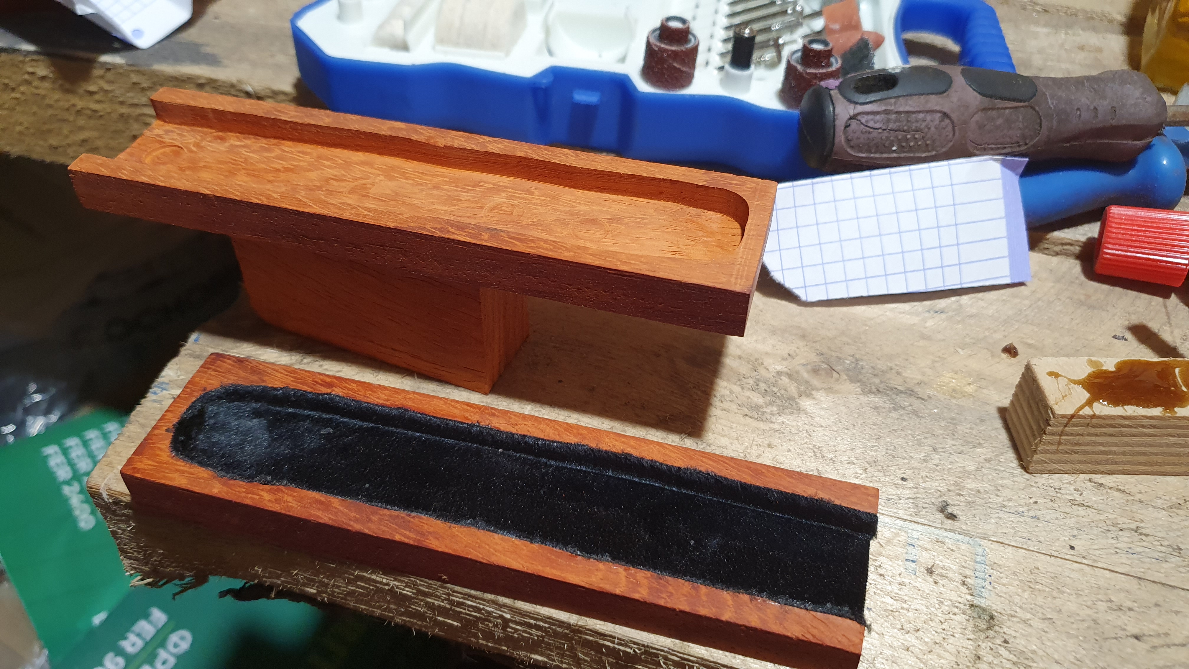 Клинковой бритвой увлекся совсем недавно, 4й месяц пошел. У знакомого приобрел бритву старенькую. Бритва была отреставрирована. Огромное спасибо WRENу. Но вот футлярчик был в совсем плачевном состоянии, да еще и не родной. Загорелся идеей собственноручно запилить футляр. Последний раз такими поделками занимался еще наверное в школе на трудах, а это больше 20ти лет назад. Для изготовления использовал падук. Внутри черным бархатом обклеил.