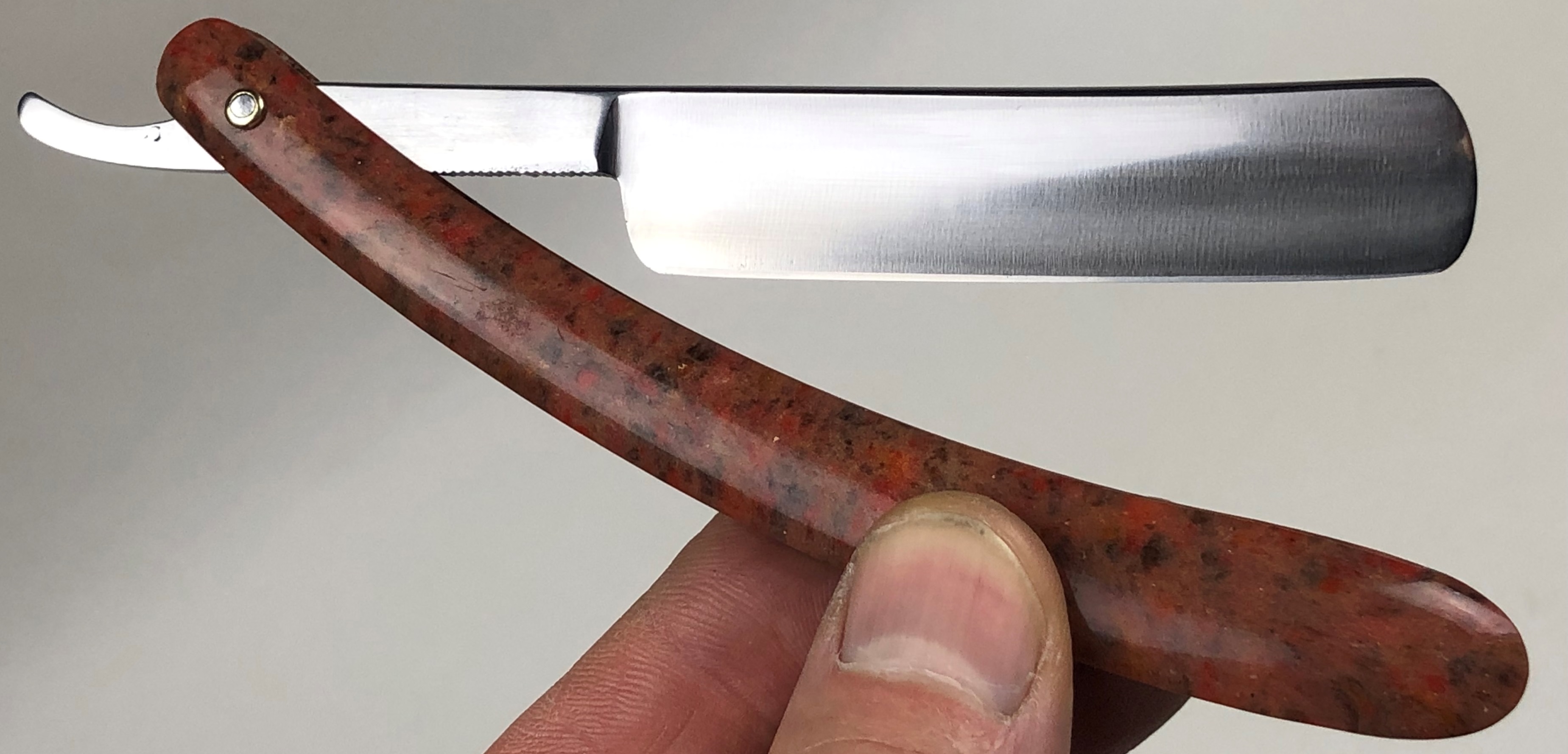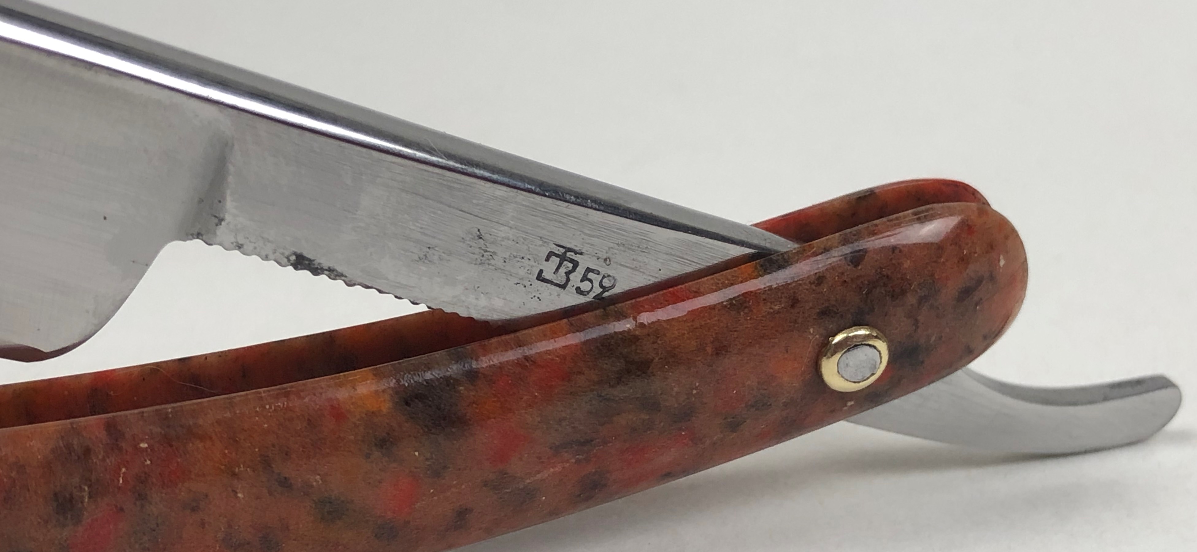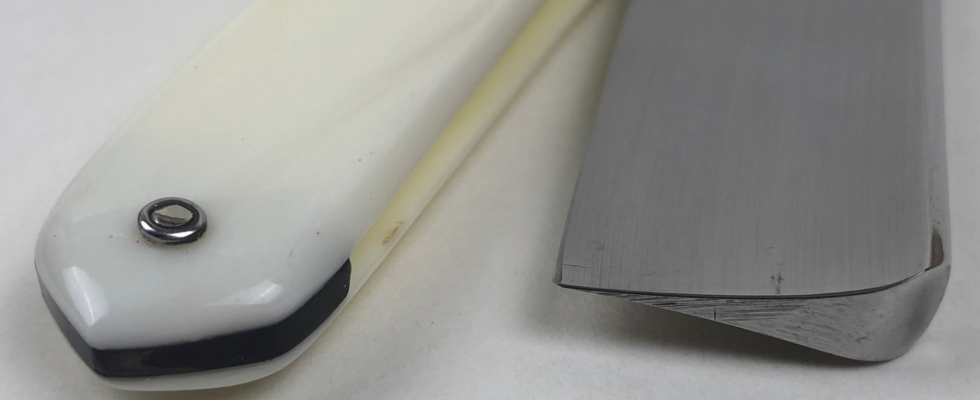 Бритва в очень хорошем состоянии. Немного откорректировал утОчку обушка и умеренно отполировал клинок.Поменял пины на двух-цветные втулки и добавил внутренние шайбы.Идеальная геометрия:кромка ровненькая по всей длине полотна.Тяжёлая.Заточена и готова к бритью.